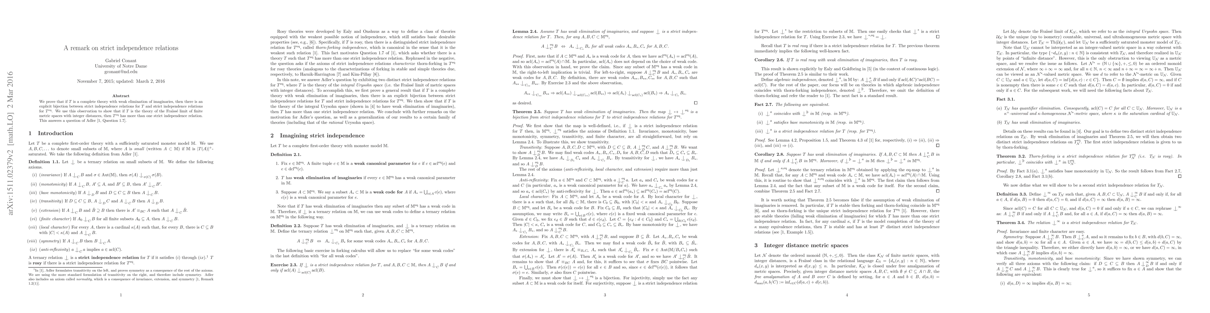 We prove that if $T$ is a complete theory with weak elimination of imaginaries, then there is an explicit bijection between strict independence relations for $T$ and strict independence relations for $T^{\text{eq}}$. We use this observation to show that if $T$ is the theory of the Fra\"{i}ss\'{e} limit of finite metric spaces with integer distances, then $T^{\text{eq}}$ has more than one strict independence relation. This answers a question of Adler [1, Question 1.7].