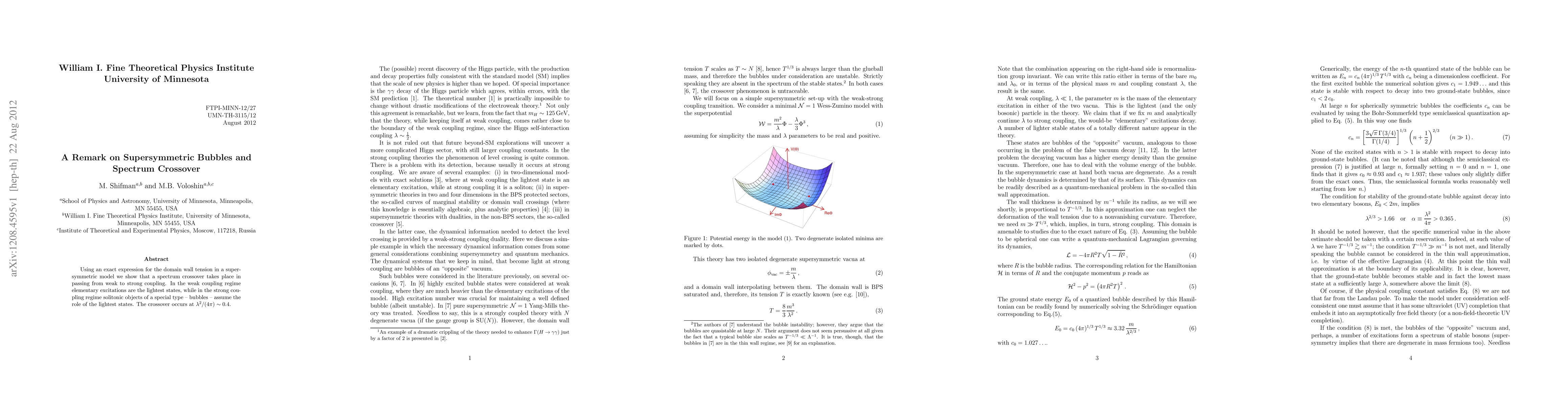 Using an exact expression for the domain wall tension in a supersymmetric model we show that a spectrum crossover takes place in passing from weak to strong coupling. In the weak coupling regime elementary excitations are the lightest states, while in the strong coupling regime solitonic objects of a special type -- bubbles -- assume the role of the lightest states. The crossover occurs at \lambda^2/(4\pi) \sim 0.4.