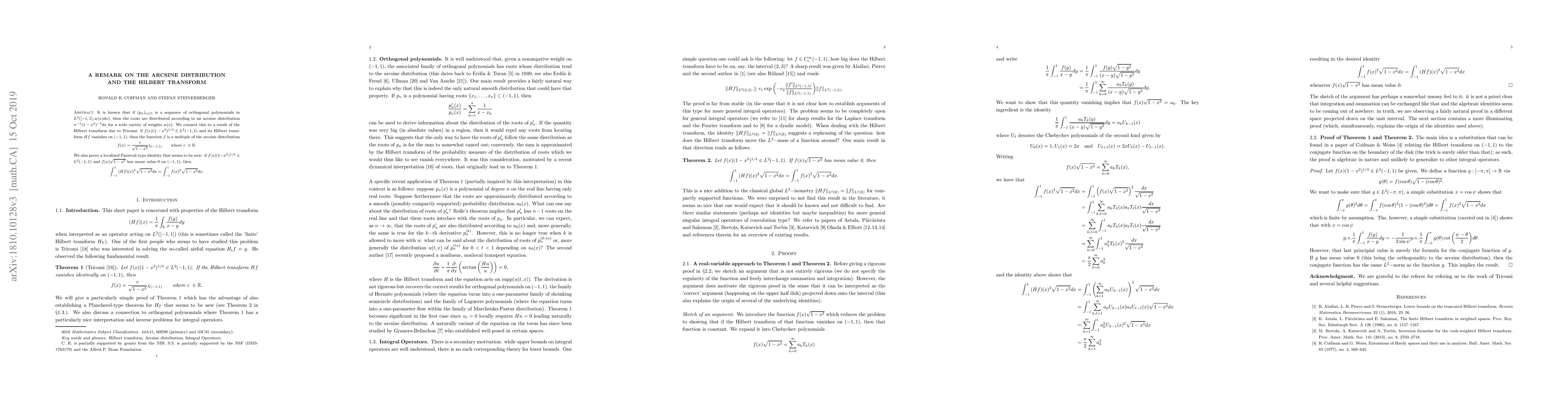 It is known that if $(p_n)_{n \in \mathbb{N}}$ is a sequence of orthogonal polynomials in $L^2([-1,1], w(x)dx)$, then the roots are distributed according to an arcsine distribution $\pi^{-1} (1-x^2)^{-1}dx$ for a wide variety of weights $w(x)$. We connect this to a result of the Hilbert transform due to Tricomi: if $f(x)(1-x^2)^{1/4} \in L^2(-1,1)$ and its Hilbert transform $Hf$ vanishes on $(-1,1)$, then the function $f$ is a multiple of the arcsine distribution $$ f(x) = \frac{c}{\sqrt{1-x^2}}\chi_{(-1,1)} \qquad \mbox{where}~c~\in \mathbb{R}.$$ We also prove a localized Parseval-type identity that seems to be new: if $f(x)(1-x^2)^{1/4} \in L^2(-1,1)$ and $f(x) \sqrt{1-x^2}$ has mean value 0 on $(-1,1)$, then $$ \int_{-1}^{1}{ (Hf)(x)^2 \sqrt{1-x^2} dx} = \int_{-1}^{1}{ f(x)^2 \sqrt{1-x^2} dx}.$$