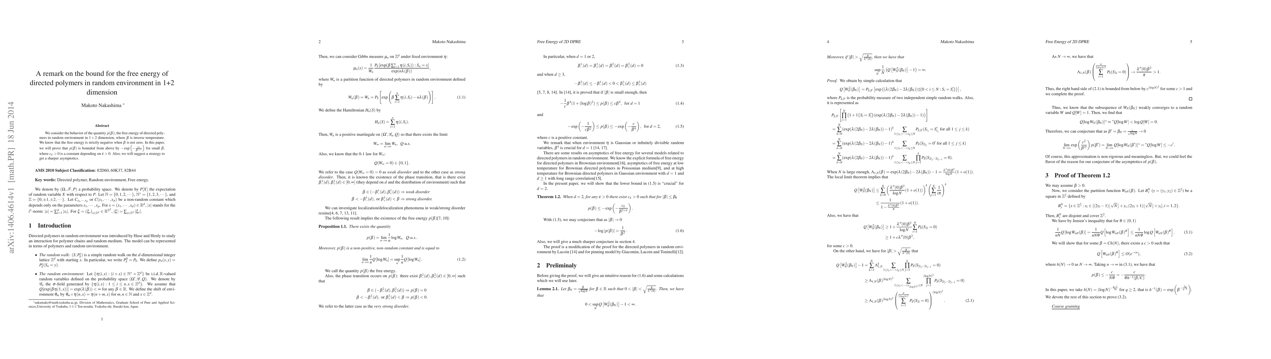 We consider the behavior of the quantity $p(\beta)$; the free energy of directed polymers in random environment in $1+2$ dimension, where $\beta$ is inverse temperature. We know that the free energy is strictly negative when $\beta$ is not zero. In this paper, we will prove that $p(\beta)$ is bounded from above by $-\exp\left( -\frac{c_\varepsilon}{\beta^{2+\varepsilon}} \right)$ for small $\beta$, where $c_\varepsilon>0$ is a constant depending on $\varepsilon>0$. Also, we will suggest a strategy to get a sharper asymptotics.