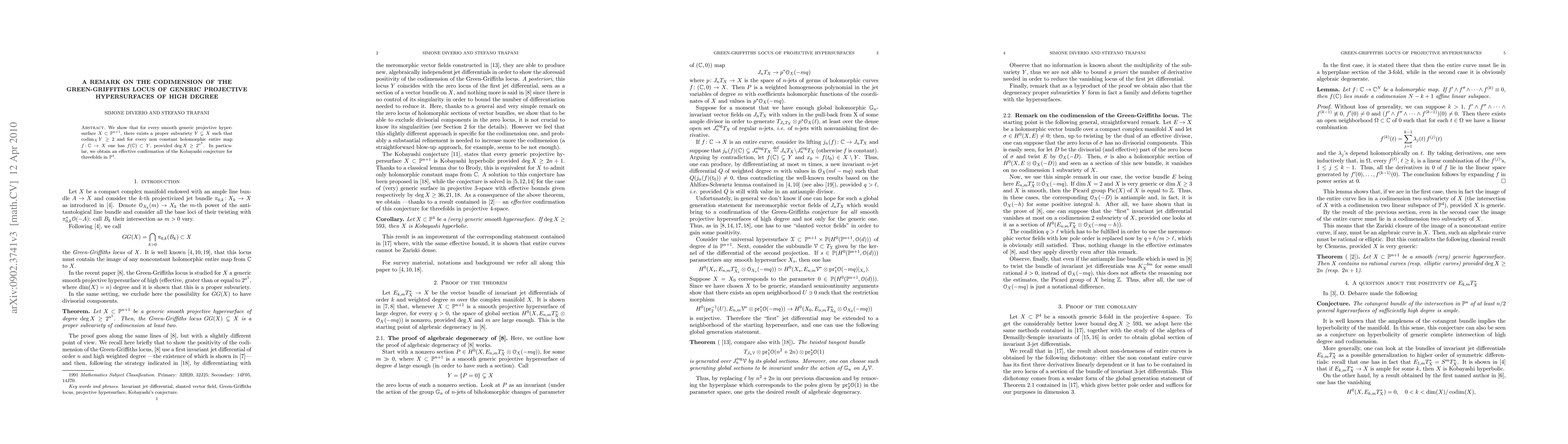 We show that for every smooth generic projective hypersurface $X\subset\mathbb P^{n+1}$, there exists a proper subvariety $Y\subsetneq X$ such that $\operatorname{codim}_X Y\ge 2$ and for every non constant holomorphic entire map $f\colon\mathbb C\to X$ one has $f(\mathbb C)\subset Y$, provided $\deg X\ge 2^{n^5}$. In particular, we obtain an effective confirmation of the Kobayashi conjecture for threefolds in $\mathbb P^4$.