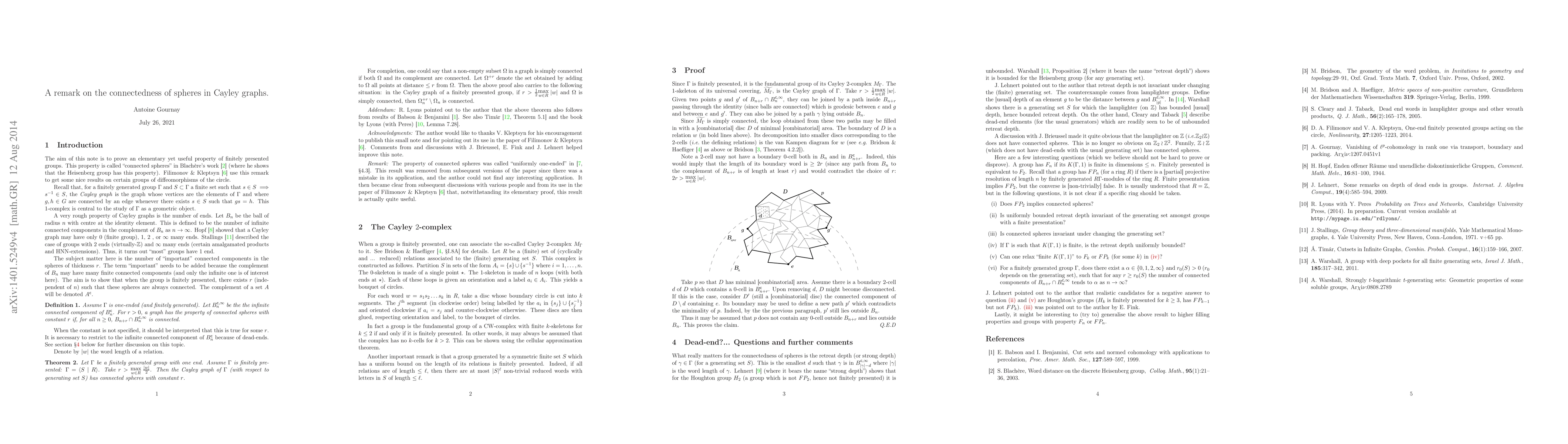 The aim of this small note is to prove an elementary yet useful properties of finitely presented groups. Let G be a finitely generated group with one end. Fix a (finite) generating set and let $B_n$ be the ball of radius $n$ around $e$. Let $B_n^{c,\infty}$ be the infinite connected component of the complement of $B_n$. Then G has connected spheres if there exists a $r >0$ such that $B_{n+r} \cap B_n^{c,\infty}$ is connected for all $n \geq 0$. This note shows that if G is finitely presented then it has connected spheres.