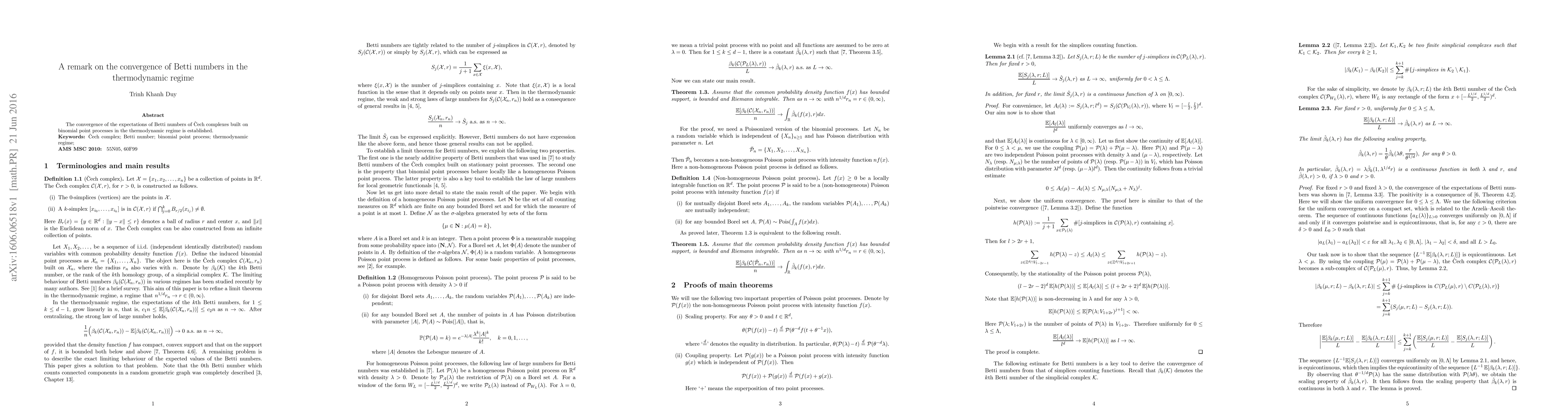 Summary: The paper establishes the convergence of expected Betti numbers for \v{C}ech complexes derived from binomial point processes in the thermodynamic regime, providing insights into topological properties in probabilistic settings.