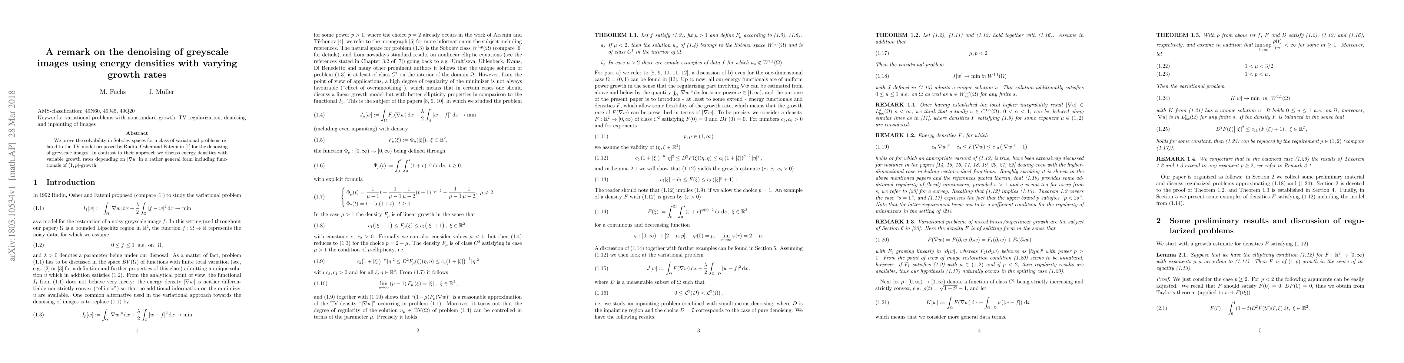 We prove the solvability in Sobolev spaces for a class of variational problems related to the TV-model proposed by Rudin, Osher and Fatemi in [1] for the denoising of greyscale images. In contrast to their approach we discuss energy densities with variable growth rates depending on $|\nabla u|$ in a rather general form including functionals of $(1, p)$-growth.