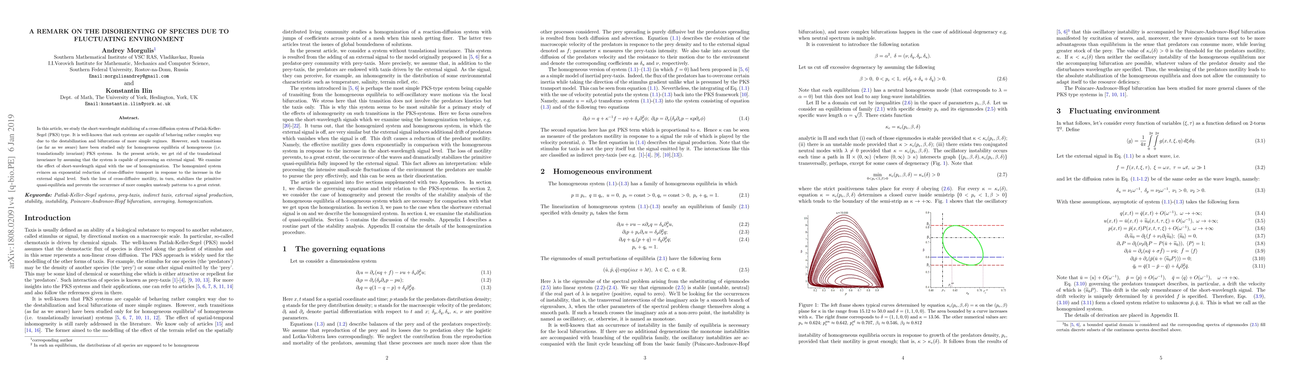 In this article we study the stabilizing of a primitive pattern of behaviour for the two-species community with chemotaxis due to the short-wavelength external signal. We use a system of Patlak-Keller-Segel type as a model of the community. It is well-known that such systems can produce complex unsteady patterns of behaviour which are usually explained mathematically by bifurcations of some basic solutions that describe simpler patterns. As far as we aware, all such bifurcations in the models of the Patlak-Keller-Segel type had been found for homogeneous (i.e. translationally invariant) systems where the basic solutions are equilibria with homogeneous distributions of all species. The model considered in the present paper does not possess the translational invariance: one of species (the predators) is assumed to be capable of moving in response to a signal produced externally in addition to the signal emitted by another species (the prey). For instance, the external signal may arise from the inhomogeneity of the distribution of an environmental characteristic such as temperature, salinity, terrain relief, etc. Our goal is to examine the effect of short-wavelength inhomogeneity. To do this, we employ a certain homogenization procedure. We separate the short-wavelength and smooth components of the system response and derive a slow system governing the latter one. Analysing the slow system and comparing it with the case of homogeneous environment shows that, generically, a short-wavelength inhomogeneity results in an exponential decrease in the motility of the predators. The loss of motility prevents, to a great extent, the occurrence of complex unsteady patterns and dramatically stabilizes the primitive basic solution. In some sense, the necessity of dealing with intensive small-scale changes of the environment makes the system unable to respond to other challenges.