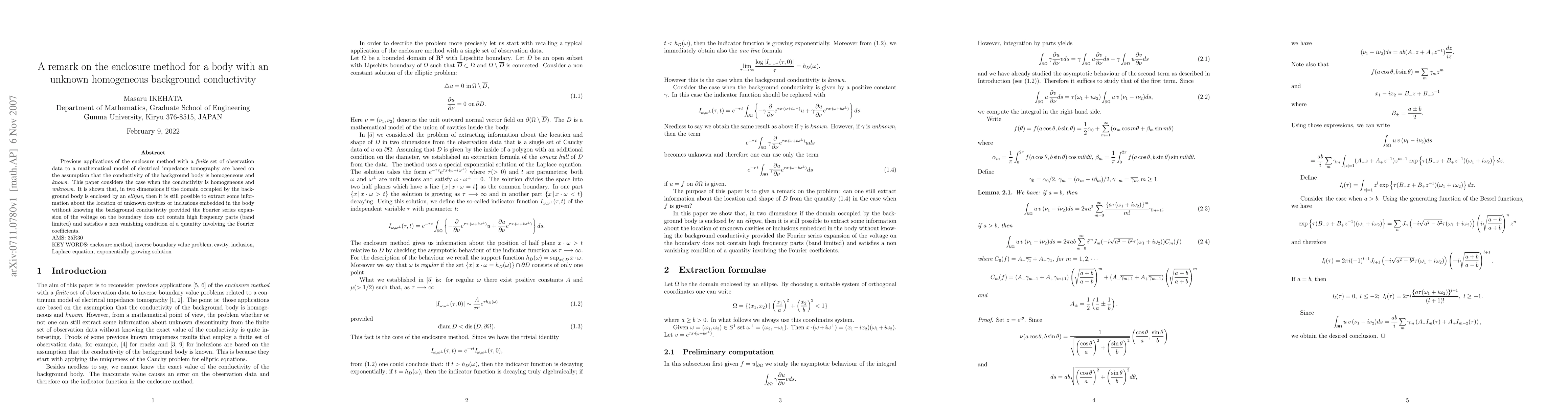 Previous applications of the enclosure method with a finite set of observation data to a mathematical model of electrical impedance tomography are based on the assumption that the conductivity of the background body is homogeneous and known. This paper considers the case when the conductivity is homogeneous and unknown. It is shown that, in two dimensions if the domain occupied by the background body is enclosed by an ellipse, then it is still possible to extract some information about the location of unknown cavities or inclusions embedded in the body without knowing the background conductivity provided the Fourier series expansion of the voltage on the boundary does not contain high frequency parts (band limited) and satisfies a non vanishing condition of a quantity involving the Fourier coefficients.