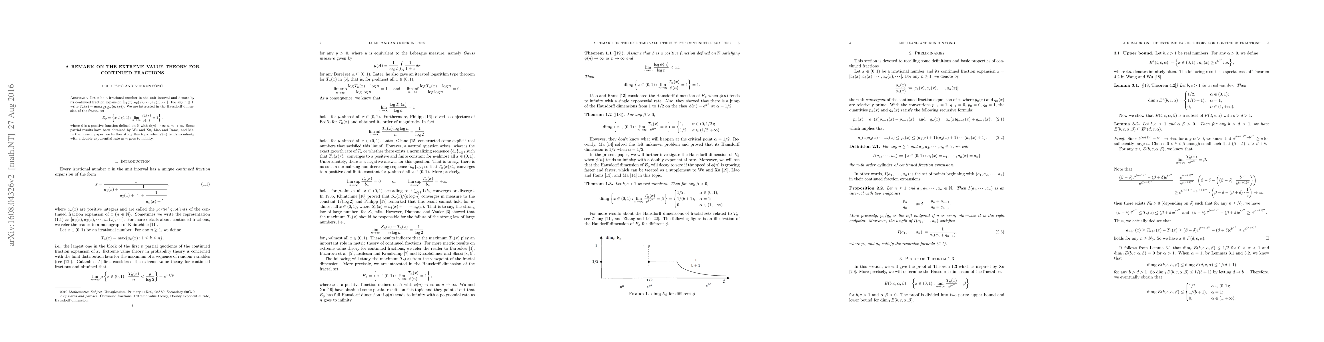This research paper investigates the extreme value theory for continued fractions and its relation to fractal sets, focusing on doubly exponential growth of a positive function ζ(n). It extends previous partial results by exploring new findings and implications.