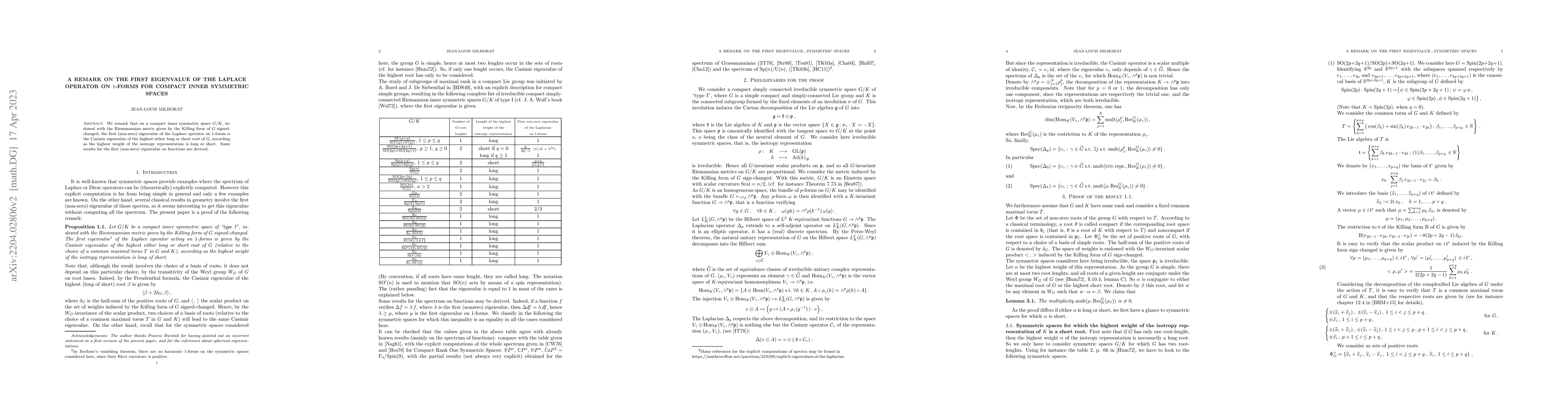 This paper establishes that the first non-zero eigenvalue of the Laplace operator on 1-forms in a compact inner symmetric space $G/K$ corresponds to the Casimir eigenvalue of the highest root of $G$, depending on whether the highest weight is long or short. The paper also corrects an earlier error regarding the spectrum on functions.