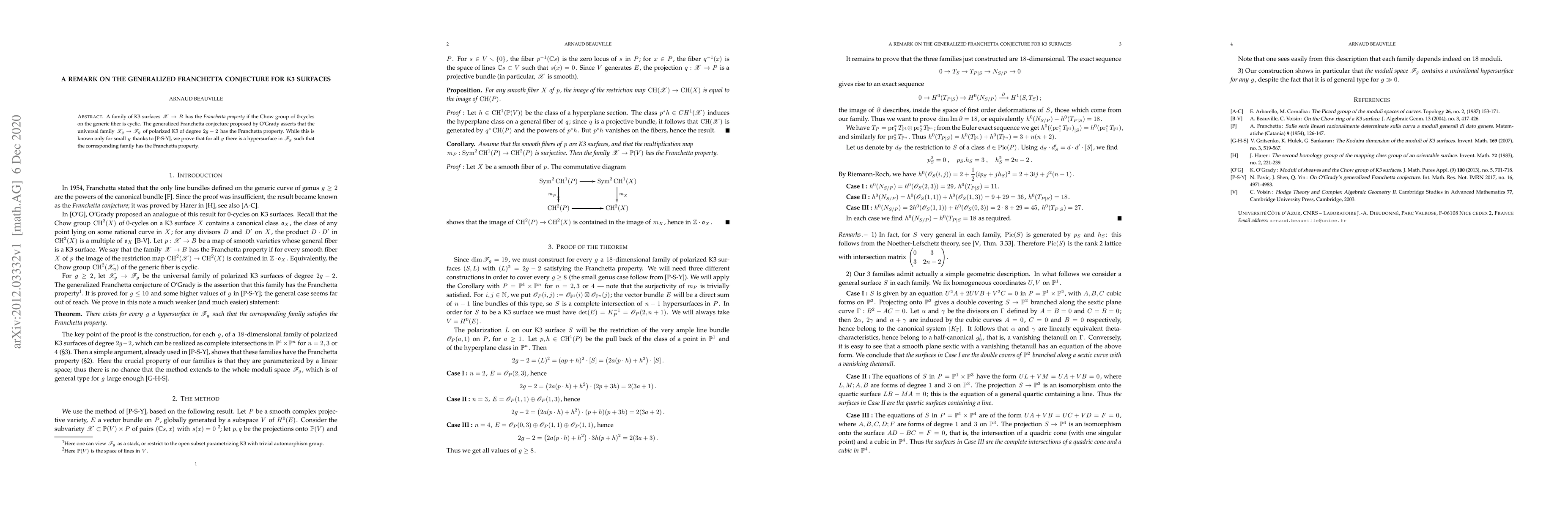 Researchers prove that for all values of g, a hypersurface in the universal family of polarized K3 surfaces has the Franchetta property, extending known results only for small g values.