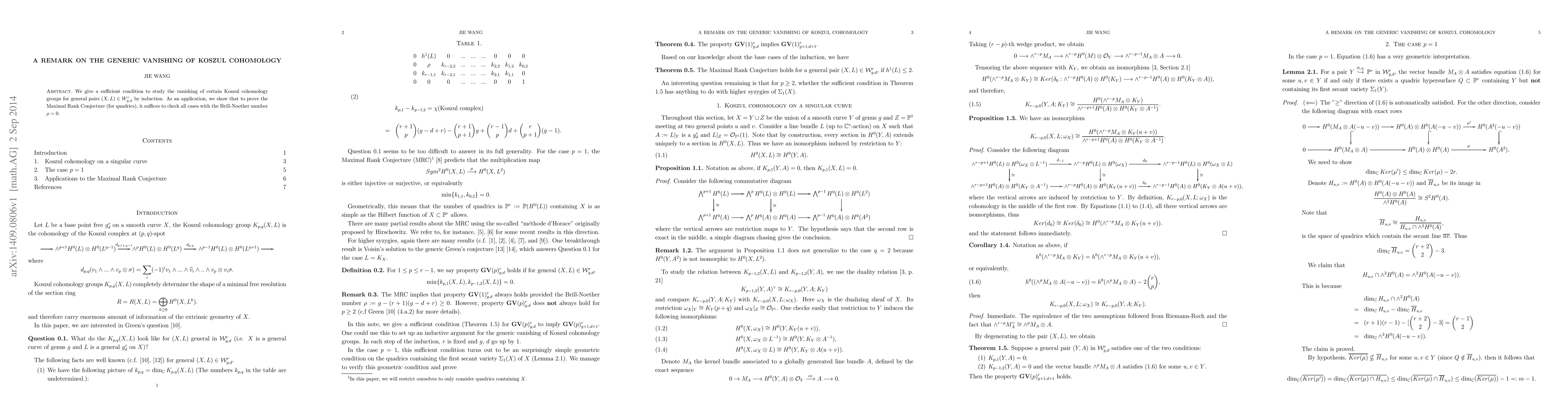 We give a sufficient condition to study the vanishing of certain Koszul cohomology groups for general pairs $(X,L)\in W^r_{g,d}$ by induction. As an application, we show that to prove the Maximal Rank Conjecture (for quadrics), it suffices to check all cases with the Brill-Noether number $\rho=0$.
