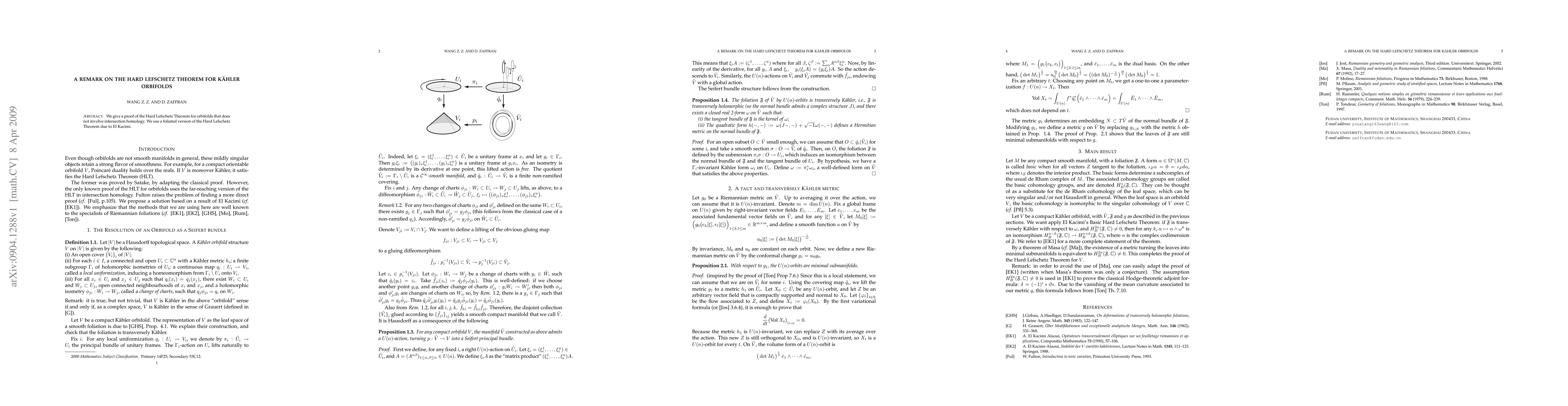 This paper provides a proof of the Hard Lefschetz theorem for Kähler orbifolds, utilizing a foliated version developed by El Kacimi instead of intersection homology, thereby answering a question posed by Fulton.