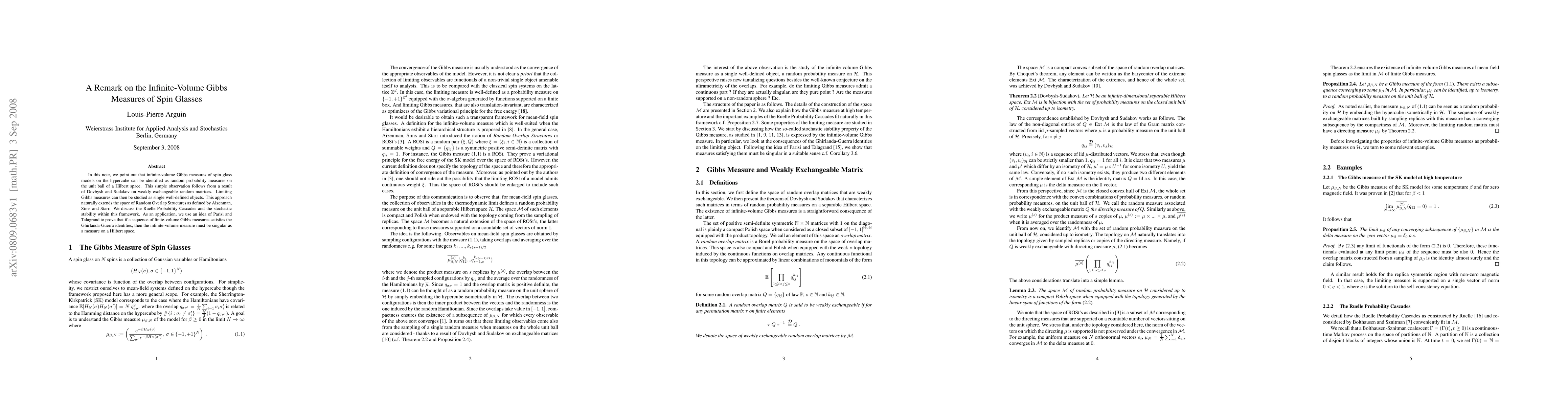 In this note, we point out that infinite-volume Gibbs measures of spin glass models on the hypercube can be identified as random probability measures on the unit ball of a Hilbert space. This simple observation follows from a result of Dovbysh and Sudakov on weakly exchangeable random matrices. Limiting Gibbs measures can then be studied as single well-defined objects. This approach naturally extends the space of Random Overlap Structures as defined by Aizenman, Sims and Starr. We discuss the Ruelle Probability Cascades and the stochastic stability within this framework. As an application, we use an idea of Parisi and Talagrand to prove that if a sequence of finite-volume Gibbs measures satisfies the Ghirlanda-Guerra identities, then the infinite-volume measure must be singular as a measure on a Hilbert space.