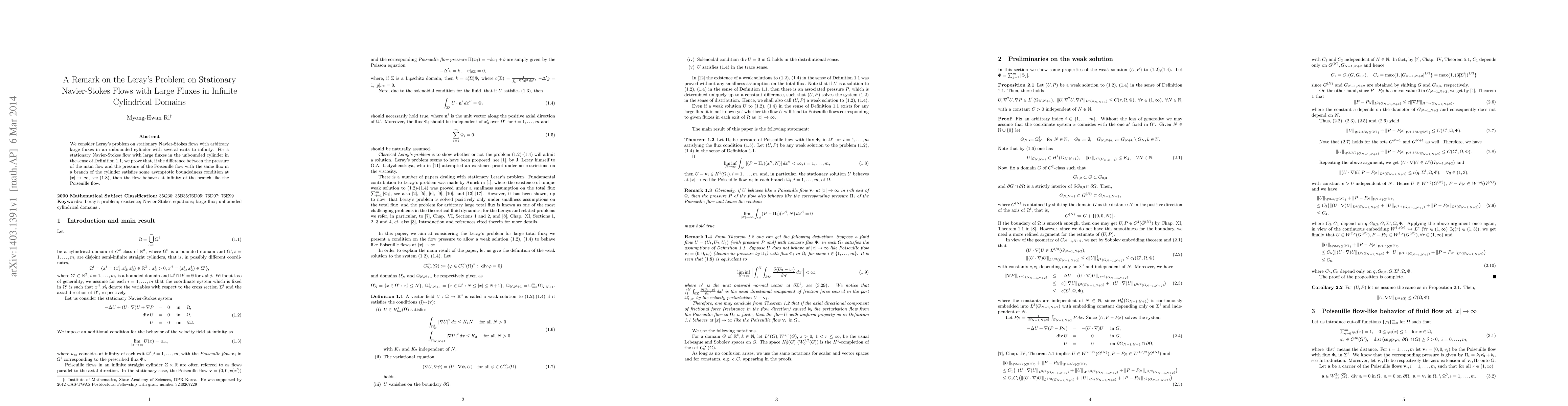 Summary: This paper addresses Leray's problem concerning stationary Navier-Stokes flows with large fluxes in infinite cylindrical domains. It proves that under certain asymptotic conditions, such flows behave like Poiseuille flows at infinity.