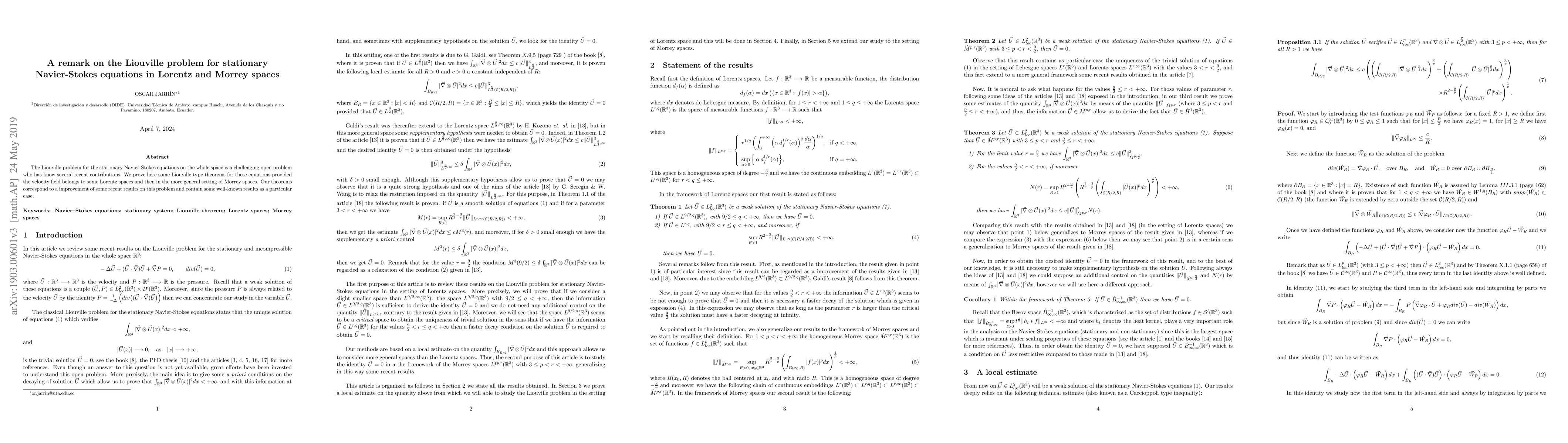 The paper proves Liouville type theorems for the stationary Navier-Stokes equations when the velocity field is in Lorentz and Morrey spaces, improving recent results and encompassing known outcomes as special cases.