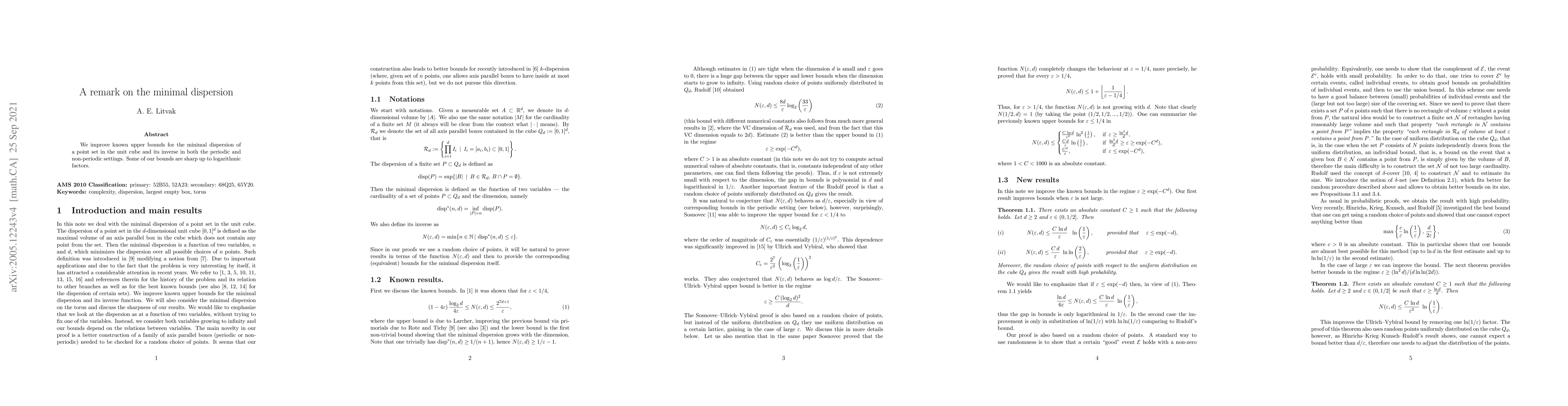 Summary: This paper enhances existing upper bounds for the minimal dispersion of point sets within the unit cube, applicable in both periodic and non-periodic contexts. The authors achieve sharp bounds, accurate up to logarithmic factors.