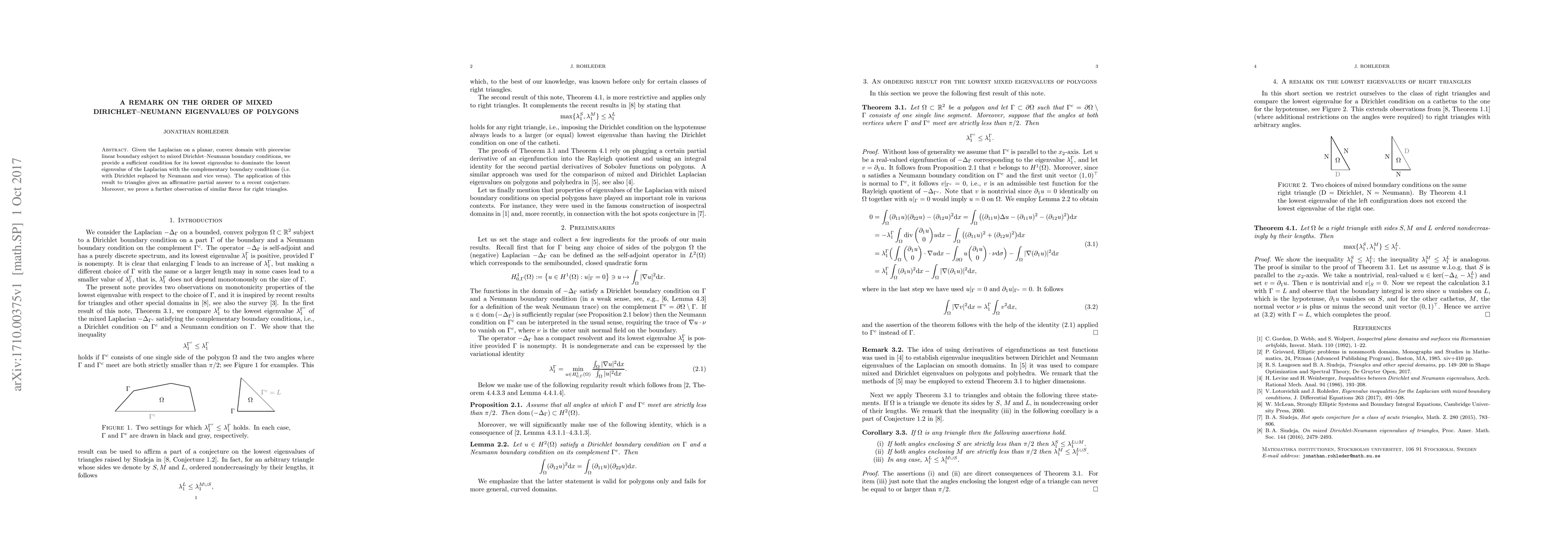 Given the Laplacian on a planar, convex domain with piecewise linear boundary subject to mixed Dirichlet-Neumann boundary conditions, we provide a sufficient condition for its lowest eigenvalue to dominate the lowest eigenvalue of the Laplacian with the complementary boundary conditions (i.e. with Dirichlet replaced by Neumann and vice versa). The application of this result to triangles gives an affirmative partial answer to a recent conjecture. Moreover, we prove a further observation of similar flavor for right triangles.