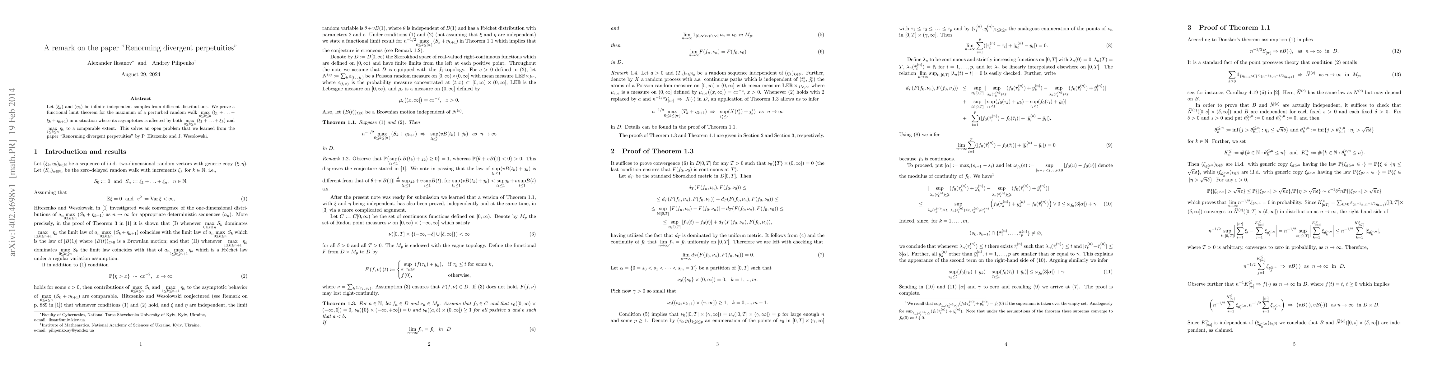 This research provides a solution to an open problem related to the paper 'Renorming divergent perpetuities'. It proves a functional limit theorem for the maximum of a perturbed random walk, influenced equally by two maxima: one from a series of independent samples from one distribution and another from independent samples from a different distribution.