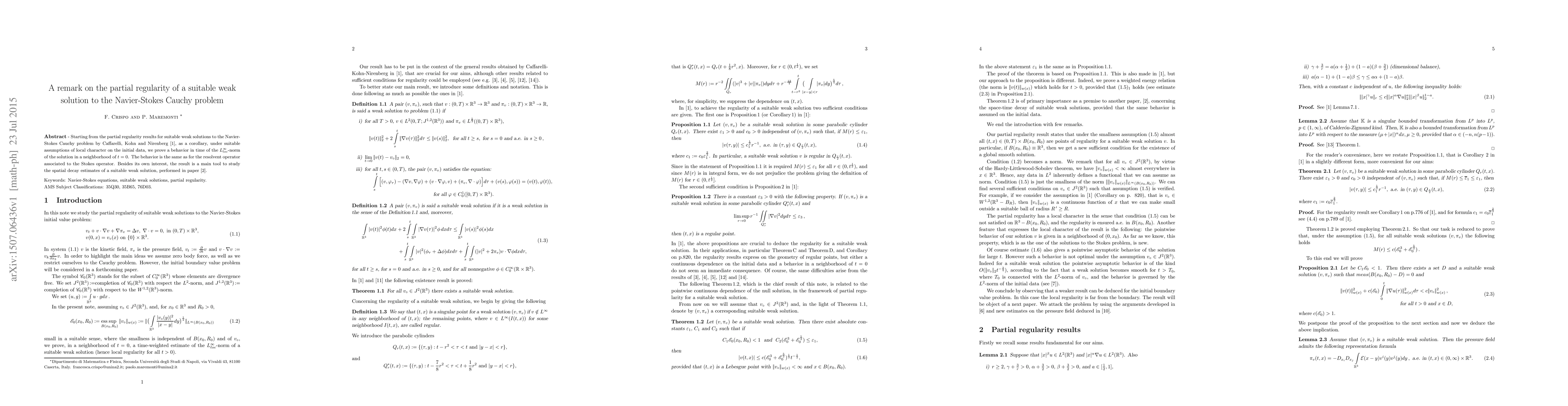Starting from the partial regularity results for suitable weak solutions to the Navier-Stokes Cauchy problem by Caffarelli, Kohn and Nirenberg, as a corollary, under suitable assumptions of local character on the initial data, we prove a behavior in time of the $L^\infty_{loc}$-norm of the solution in a neighborhood of $t=0$. The behavior is the same as for the resolvent operator associated to the Stokes operator. Besides its own interest, the result is a main tool to study the spatial decay estimates of a suitable weak solution, performed in paper F. Crispo and P. Maremonti, On the spatial asymptotic decay of a suitable weak solution to the Navier-Stokes Cauchy problem (submitted).