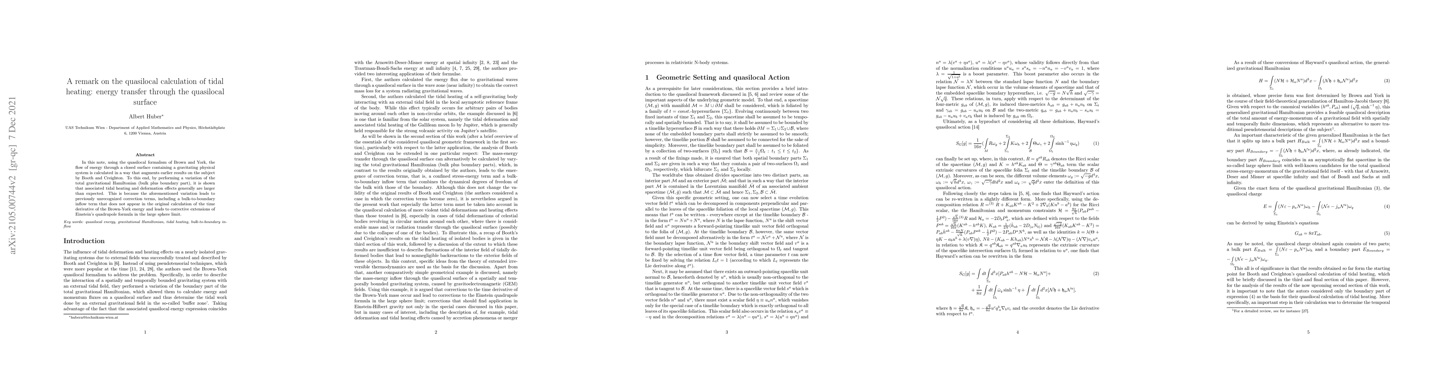 In this note, using the quasilocal formalism of Brown and York, the flow of energy through a closed surface containing a gravitating physical system is calculated in a way that augments earlier results on the subject by Booth and Creighton. To this end, by performing a variation of the total gravitational Hamiltonian (bulk plus boundary part), it is shown that associated tidal heating and deformation effects generally are larger than expected. This is because this variation leads to previously unrecognized correction terms, including a bulk-to-boundary inflow term that does not appear in the original calculation of the time derivative of the Brown-York energy and leads to corrective extensions of Einstein's quadrupole formula in the large sphere limit.