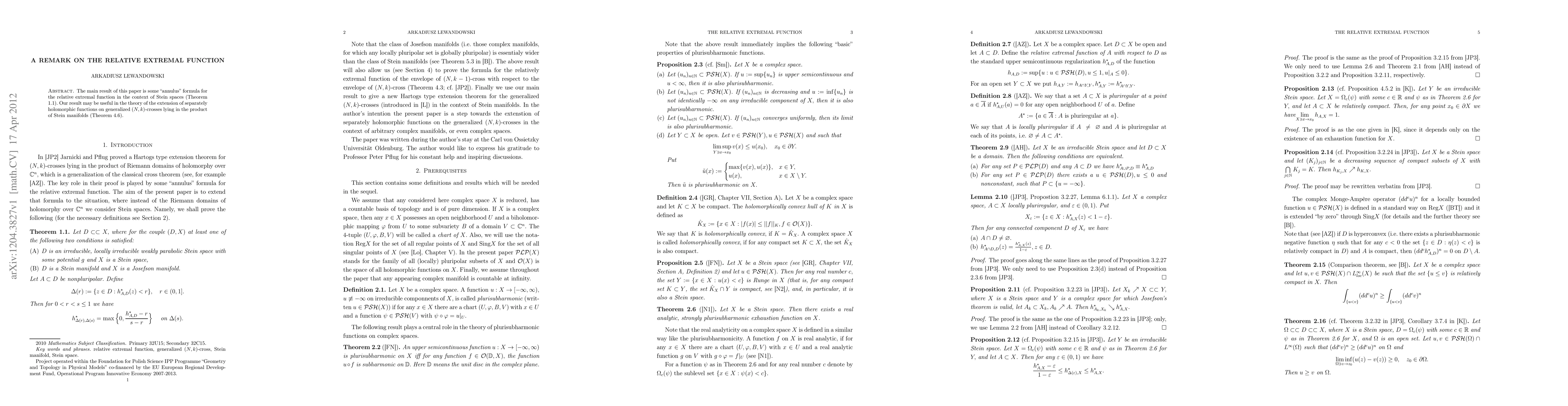 The main result of this paper is some "annulus" formula for the relative extremal function in the context of Stein spaces (Theorem 1.1). Our result may be useful in the theory of the extension of separately holomorphic functions on generalized (N,k)-crosses lying in the product of Stein manifolds (Theorem 4.6).