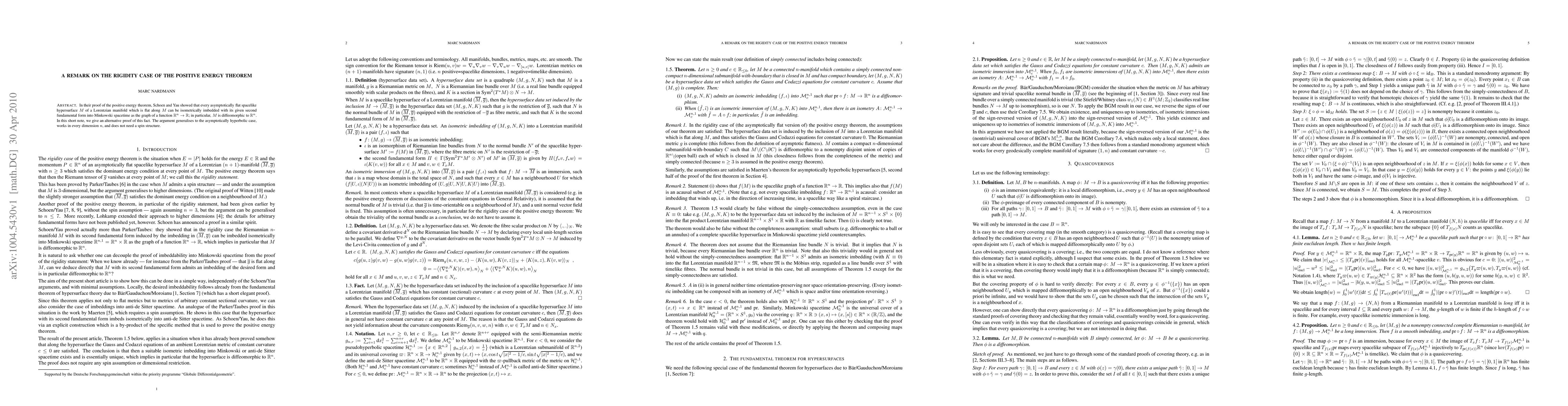 In their proof of the positive energy theorem, Schoen and Yau showed that every asymptotically flat spacelike hypersurface M of a Lorentzian manifold which is flat along M can be isometrically imbedded with its given second fundamental form into Minkowski spacetime as the graph of a function from R^n to R; in particular, M is diffeomorphic to R^n. In this short note, we give an alternative proof of this fact. The argument generalises to the asymptotically hyperbolic case, works in every dimension n, and does not need a spin structure.