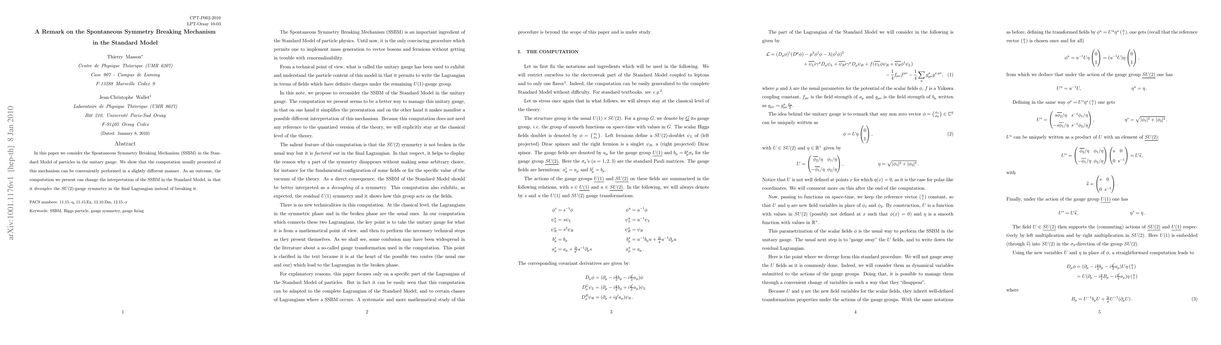 In this paper we consider the Spontaneous Symmetry Breaking Mechanism (SSBM) in the Standard Model of particles in the unitary gauge. We show that the computation usually presented of this mechanism can be conveniently performed in a slightly different manner. As an outcome, the computation we present can change the interpretation of the SSBM in the Standard Model, in that it decouples the SU(2)-gauge symmetry in the final Lagrangian instead of breaking it.