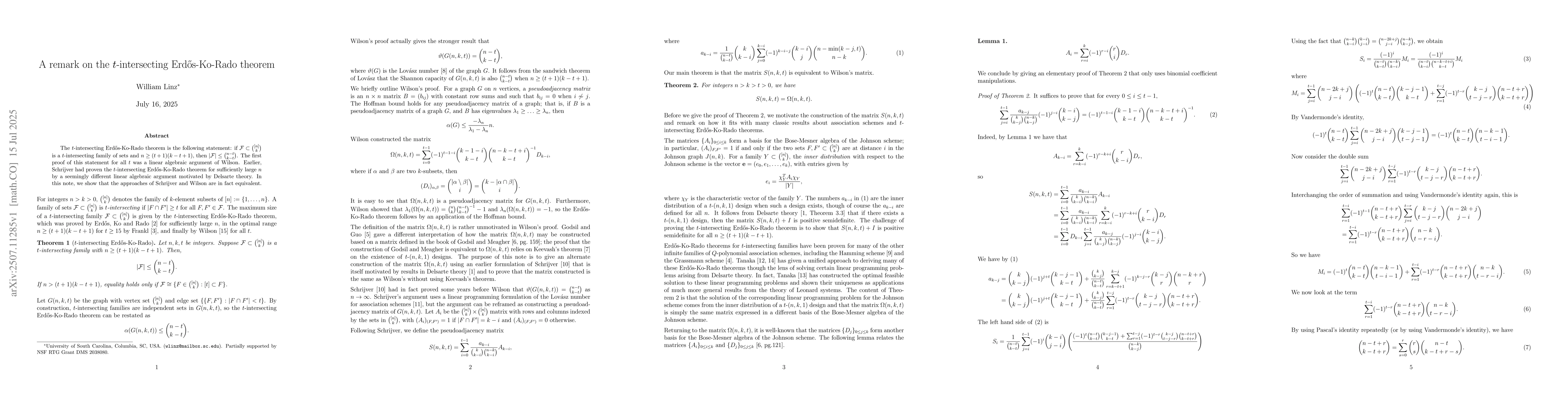 The $t$-intersecting Erd\H{o}s-Ko-Rado theorem is the following statement: if $\mathcal{F} \subset \binom{[n]}{k}$ is a $t$-intersecting family of sets and $n\ge (t+1)(k-t+1)$, then $|\mathcal{F}| \le \binom{n-t}{k-t}$. The first proof of this statement for all $t$ was a linear algebraic argument of Wilson. Earlier, Schrijver had proven the $t$-intersecting Erd\H{o}s-Ko-Rado theorem for sufficiently large $n$ by a seemingly different linear algebraic argument motivated by Delsarte theory. In this note, we show that the approaches of Schrijver and Wilson are in fact equivalent.