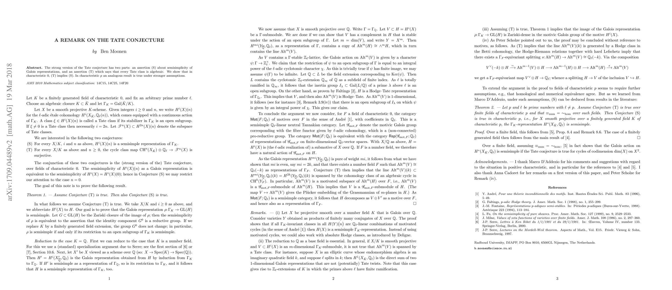 The Tate conjecture has two parts: an assertion (S) about semisimplicity of Galois representations, and an assertion (T) which says that every Tate class is algebraic. We show that in characteristic 0, (T) implies (S). In characteristic p an analogous result is true under stronger assumptions.