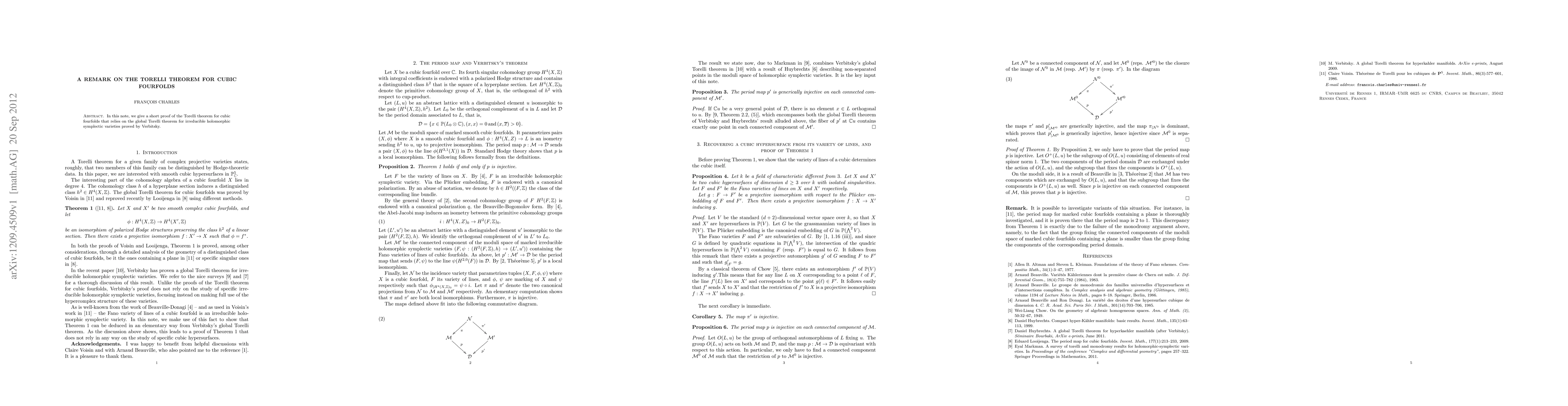 Summary: This paper presents a concise proof of the Torelli theorem for cubic fourfolds, utilizing Verbitsky's global Torelli theorem for irreducible holomorphic symplectic varieties as a foundation. The approach highlights the connections between these complex geometric structures.