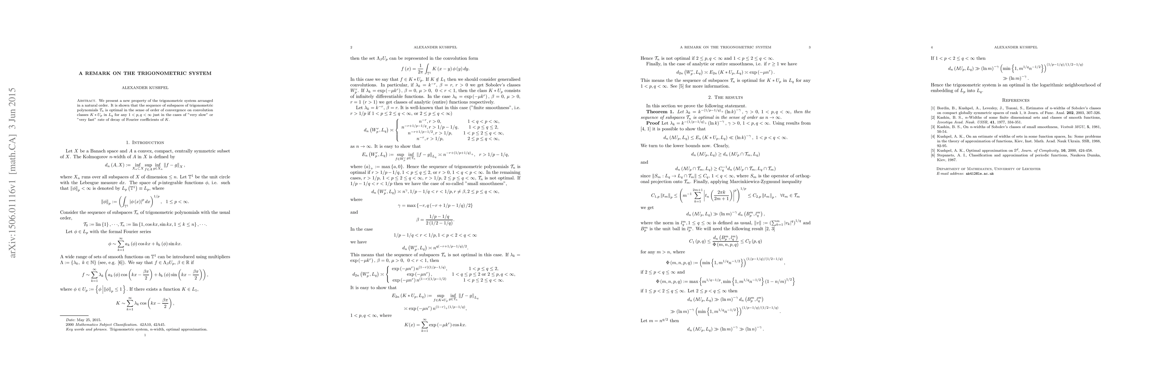We present a new property of the trigonometric system arranged in a natural order. It is shown that the sequence of subspaces of trigonometric polynomials is optimal in the sense of order of convergence on convolution classes K*Up in Lq for any 1