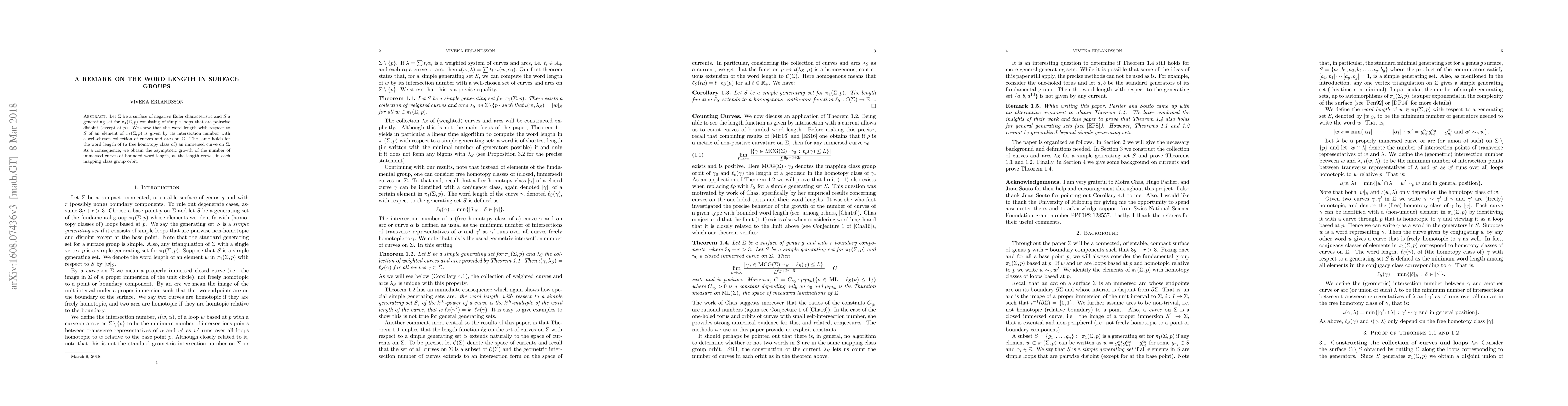 This paper demonstrates that the word length in surface groups, with respect to a generating set of simple loops, corresponds to the intersection number with a specific set of curves and arcs on the surface. It also establishes the asymptotic growth of the number of immersed curves within each mapping class group orbit as their word length increases.
