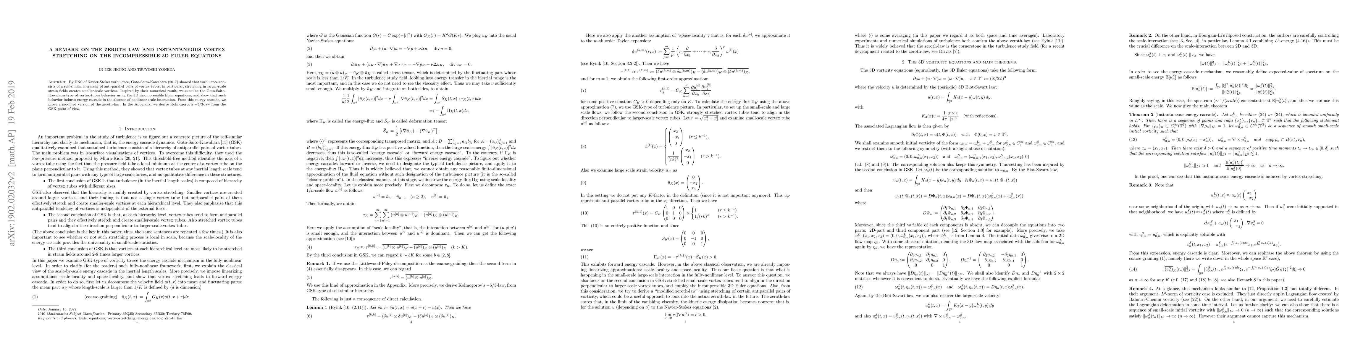 This paper explores the behavior of vortex tubes in the 3D incompressible Euler equations, demonstrating that vortex stretching in larger-scale strain fields generates smaller-scale vortices, leading to an energy cascade. It proposes a modified zeroth-law and derives Kolmogorov's $-5/3$-law from the Goto-Saito-Kawahara perspective.