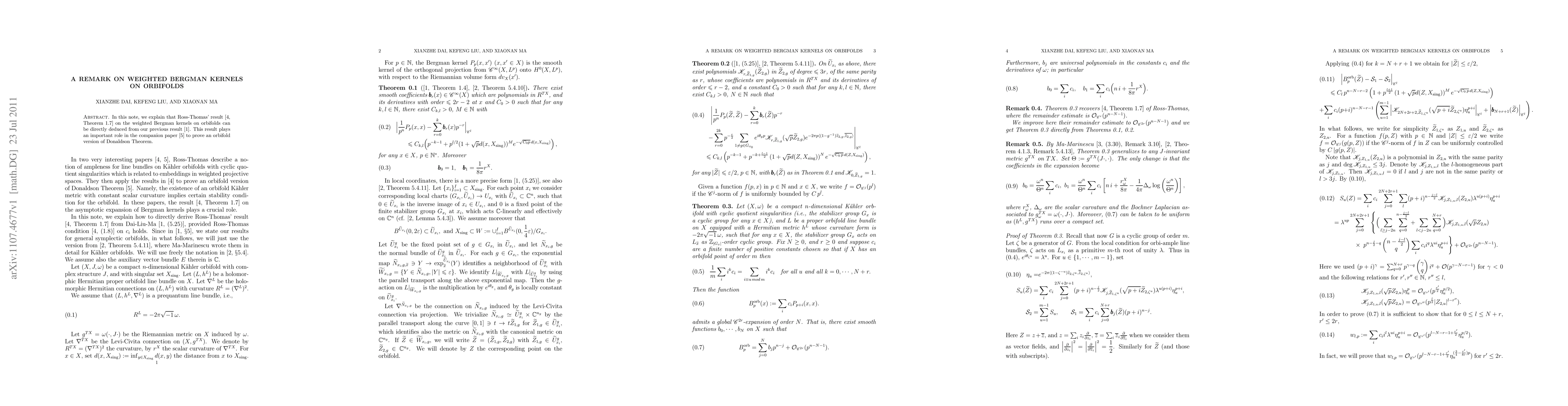 Researchers build upon their previous work to prove Ross-Thomas' result on weighted Bergman kernels on orbifolds, a key component in proving an orbifold version of Donaldson Theorem.