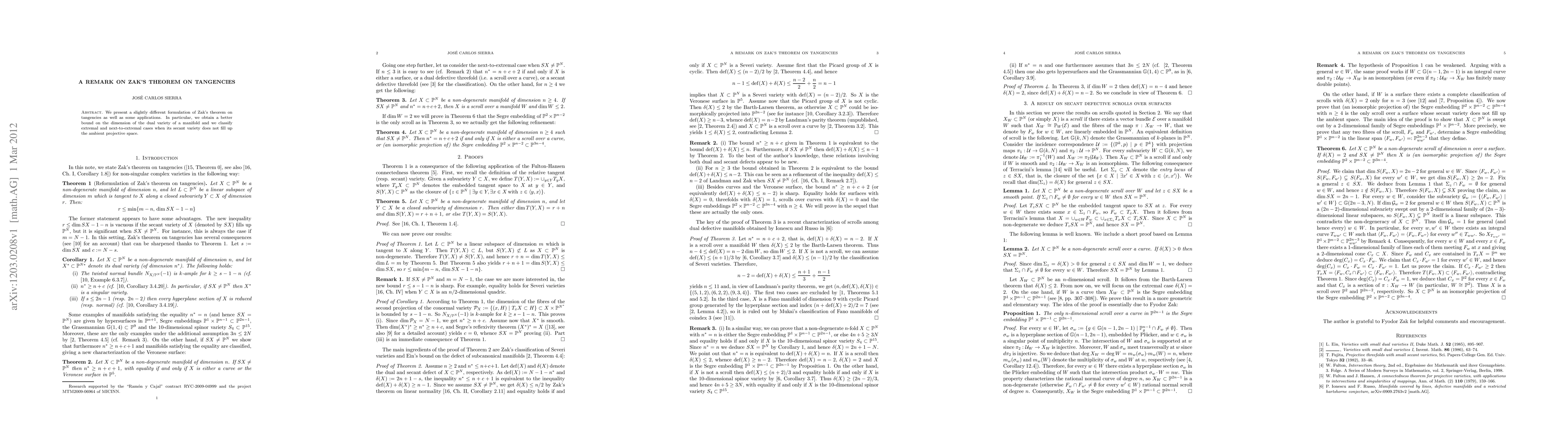 This paper reformulates Zak's theorem on tangencies, providing improved dimension bounds for the dual variety of a manifold. It also classifies cases where a manifold's secant variety doesn't completely occupy the ambient space.