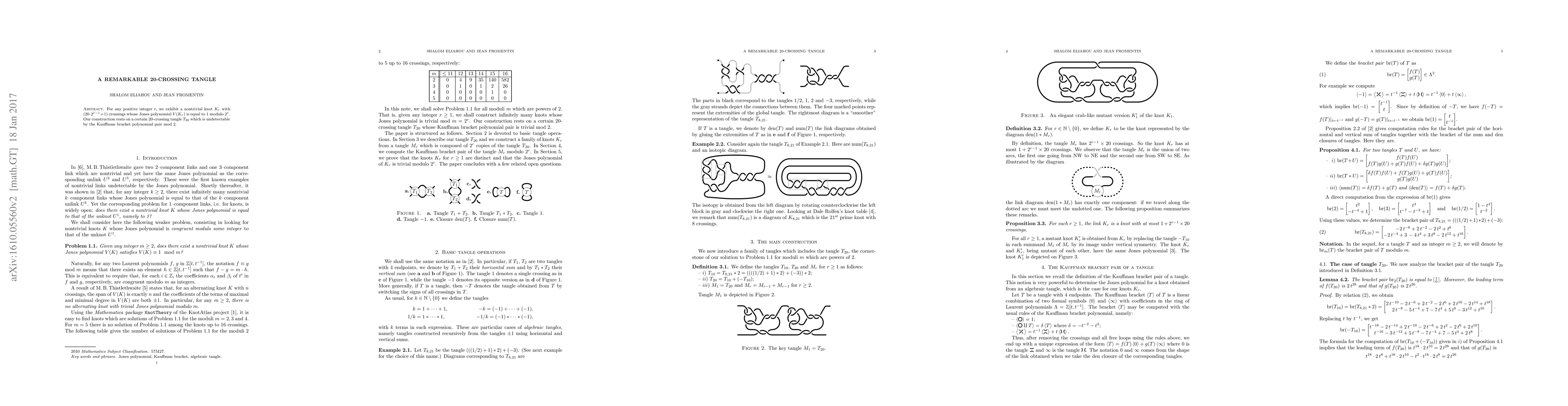 The paper introduces a 20-crossing tangle T20 and a family of knots Mr, demonstrating their Kauffman bracket polynomial properties and Jones polynomial behavior under modulo 2r constraints.