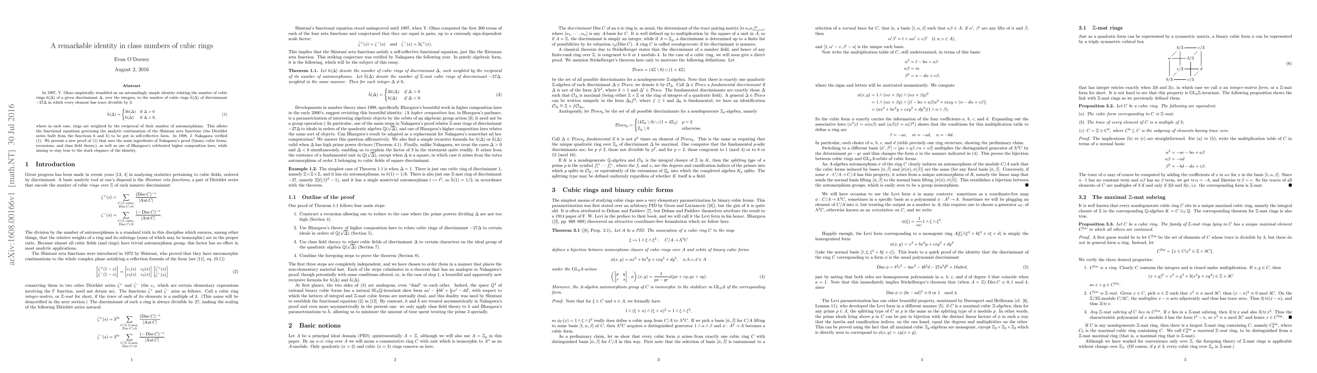 In 1997, Y. Ohno empirically stumbled on an astoundingly simple identity relating the number of cubic rings $h(D)$ of a given discriminant $D$, over the integers, to the number of cubic rings $h'(D)$ of discriminant $-27D$ in which every element has trace divisible by 3: $h'(D) = h(D)$, if $D < 0$, and $h'(D) = 3h(D)$ if $D > 0$, where in each case, rings are weighted by the reciprocal of their number of automorphisms. This allows the functional equations governing the analytic continuation of the Shintani zeta functions (the Dirichlet series built from the values of $h$ and $h'$) to be put in self-reflective form. In 1998, J. Nakagawa verified Ohno's conjecture. We present a new proof of the identity that uses the main ingredients of Nakagawa's proof (binary cubic forms, recursions, and class field theory), as well as one of Bhargava's celebrated higher composition laws, while aiming to stay true to the stark elegance of the identity.