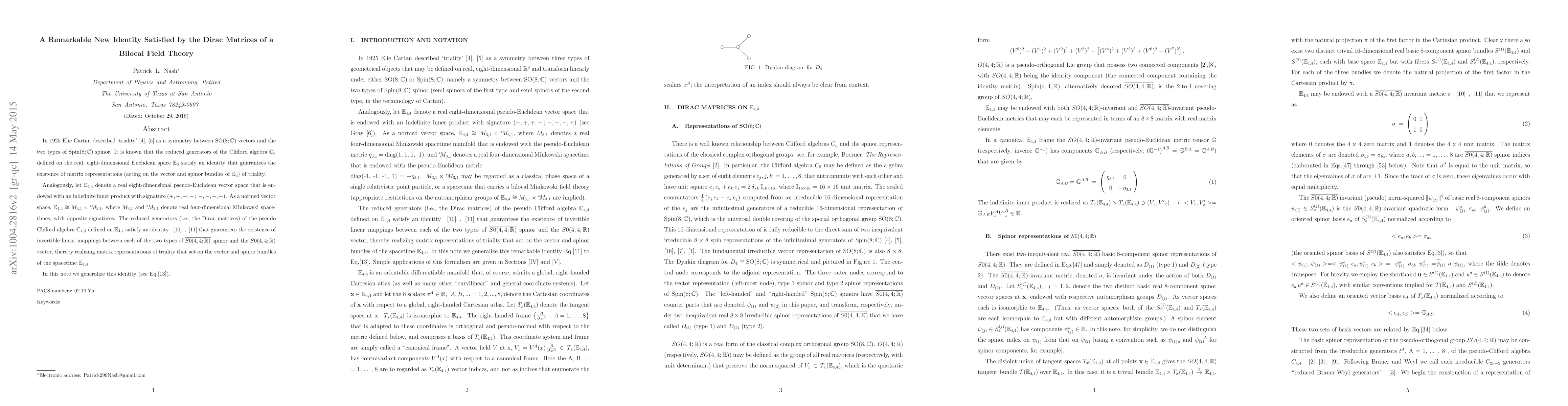 In 1925 Elie Cartan described `triality' \cite{CARTAN25}, \cite{CARTAN} as a symmetry between SO$(8; \mathbb{C})$ vectors and the two types of Spin$(8; \mathbb{C})$ spinor. It is known that the reduced generators of the Clifford algebra $\mathbb{C}_{8}$ defined on the real, eight-dimensional Euclidean space $\mathbb{E}_{8}$ satisfy an identity that guarantees the existence of matrix representations (acting on the vector and spinor bundles of $\mathbb{E}_{8}$) of triality. Analogously, let $\mathbb{E}_{4,4}$ denote a real eight-dimensional pseudo-Euclidean vector space that is endowed with an indefinite inner product with signature $(+,+,+,-\,;\,-,-,-,+)$. As a normed vector space, $\mathbb{E}_{4,4} \cong M_{3,1} \times {}^{*}\!M_{3,1}$, where $M_{3,1}$ and ${}^{*}\!M_{3,1}$ denote real four-dimensional Minkowski spacetimes, with opposite signatures. %Clearly, bilocal Minkowski field theories may be cast on the $\mathbb{E}_{4,4}$ spacetime. The reduced generators (i.e., the Dirac matrices) of the pseudo Clifford algebra $\mathbb{C}_{4,4}$ defined on $\mathbb{E}_{4,4}$ satisfy an identity $\,$ \cite{NASH86} $\,,\,$ \cite{NASH90} that guarantees the existence of invertible linear mappings between each of the two types of $\overline{S0(4,4; \mathbb{R})}$ spinor and the ${S0(4,4; \mathbb{R})}$ vector, thereby realizing matrix representations of triality that act on the vector and spinor bundles of the spacetime $\mathbb{E}_{4,4}$. In this note we generalize this identity (see Eq.[\ref{newIdentity}]).
