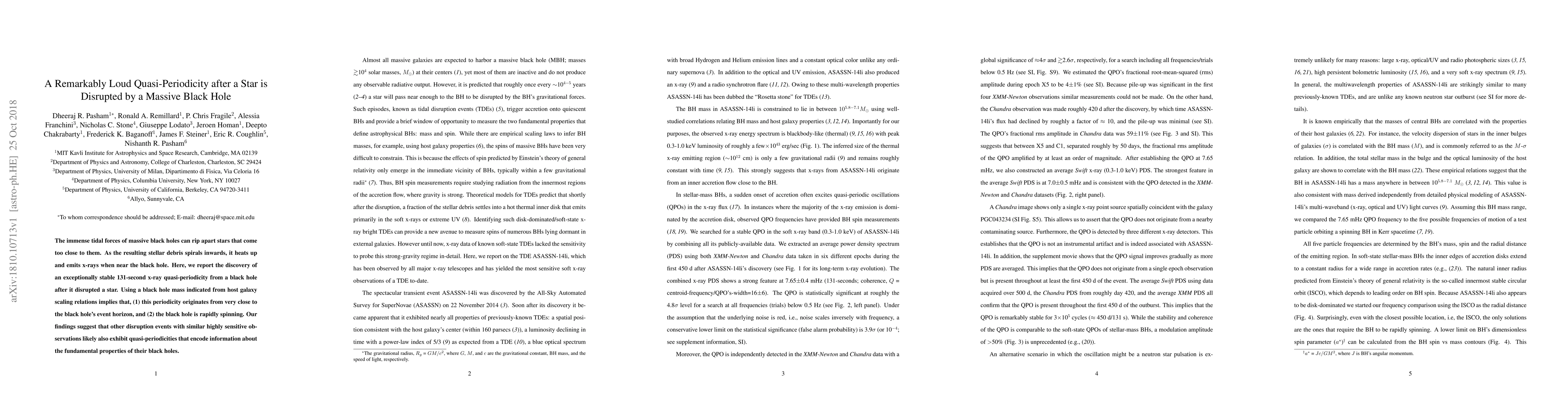 This study reports a remarkably stable 131-second x-ray quasi-periodicity from a disrupted star spiraling into a massive black hole, indicating the black hole's rapid spin and suggesting that such periodicities may reveal fundamental properties of black holes in similar events.