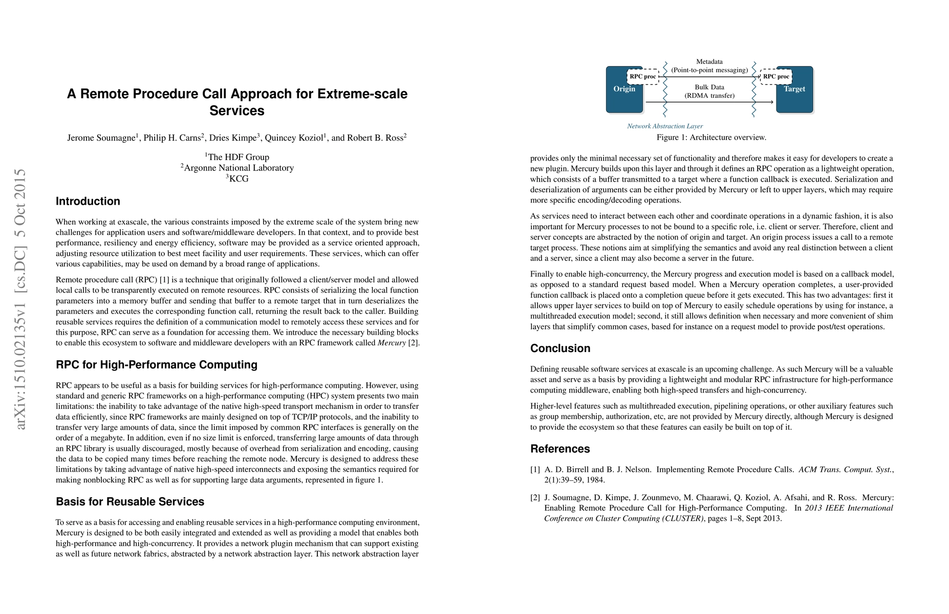 When working at exascale, the various constraints imposed by the extreme scale of the system bring new challenges for application users and software/middleware developers. In that context, and to provide best performance, resiliency and energy efficiency, software may be provided as a service oriented approach, adjusting resource utilization to best meet facility and user requirements. Remote procedure call (RPC) is a technique that originally followed a client/server model and allowed local calls to be transparently executed on remote resources. RPC consists of serializing the local function parameters into a memory buffer and sending that buffer to a remote target that in turn deserializes the parameters and executes the corresponding function call, returning the result back to the caller. Building reusable services requires the definition of a communication model to remotely access these services and for this purpose, RPC can serve as a foundation for accessing them. We introduce the necessary building blocks to enable this ecosystem to software and middleware developers with an RPC framework called Mercury.