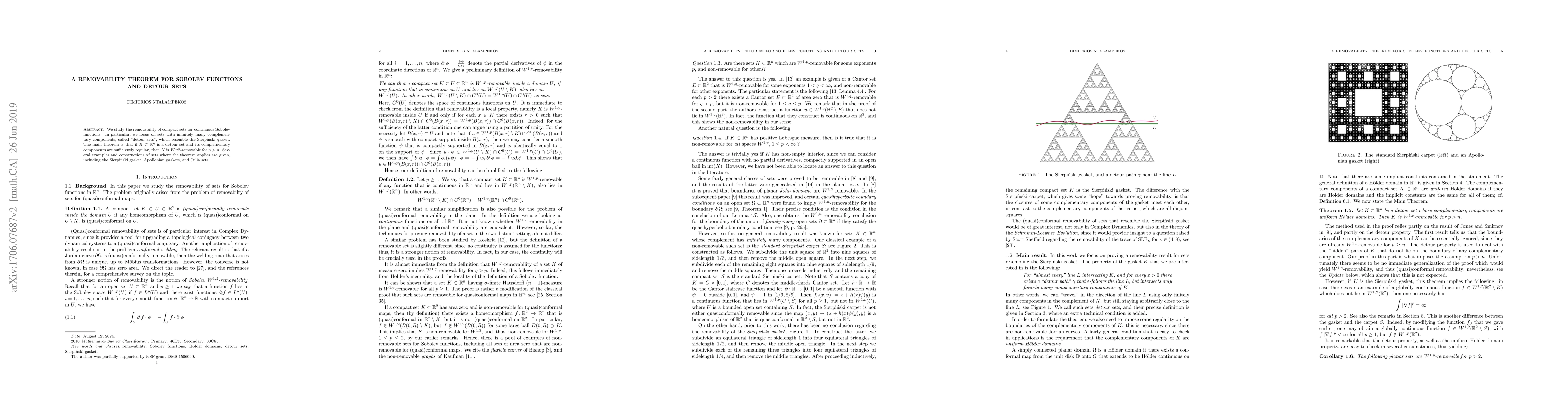 The paper proves that compact detour sets in n-dimensional space are $W^{1,p}$-removable for p > n, if their complementary components are sufficiently regular, offering insight into the removability of Sobolev functions.