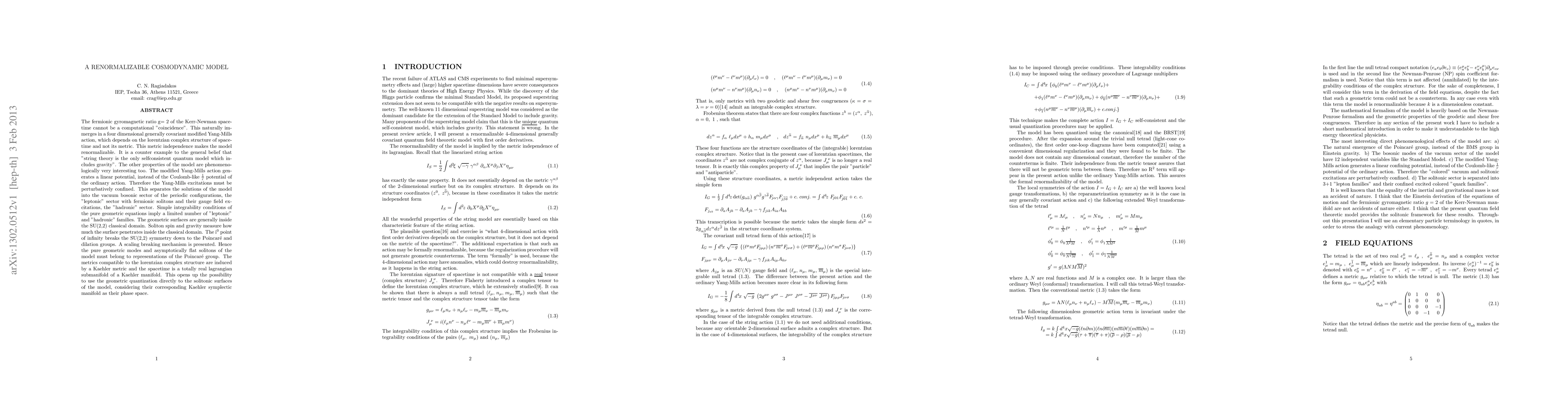 The fermionic gyromagnetic ratio g= 2 of the Kerr-Newman spacetime cannot be a computational "coincidence". This naturally immerges in a four dimensional generally covariant modified Yang-Mills action, which depends on the lorentzian complex structure of spacetime and not its metric. This metric independence makes the model renormalizable. It is a counter example to the general belief that "string theory is the only selfconsistent quantum model which includes gravity". The other properties of the model are phenomenologically very interesting too. The modified Yang-Mills action generates a linear potential, instead of the Coulomb-like (1/r) potential of the ordinary action. Therefore the Yang-Mills excitations must be perturbatively confined. This separates the solutions of the model into the vacuum bosonic sector of the periodic configurations, the "leptonic" sector with fermionic solitons and their gauge field excitations, the "hadronic" sector. Simple integrability conditions of the pure geometric equations imply a limited number of "leptonic" and "hadronic" families. The geometric surfaces are generally inside the SU(2,2) classical domain. Soliton spin and gravity measure how much the surface penetrates inside the classical domain. The i0 point of infinity breaks the SU(2,2) symmetry down to the Poincare and dilation groups. A scaling breaking mechanism is presented. Hence the pure geometric modes and asymptotically flat solitons of the model must belong to representations of the Poincare group. The metrics compatible to the lorentzian complex structure are induced by a Kaehler metric and the spacetime is a totally real lagrangian submanifold of a Kaehler manifold. This opens up the possibility to use the geometric quantization directly to the solitonic surfaces of the model, considering their corresponding Kaehler symplectic manifold as their phase space.