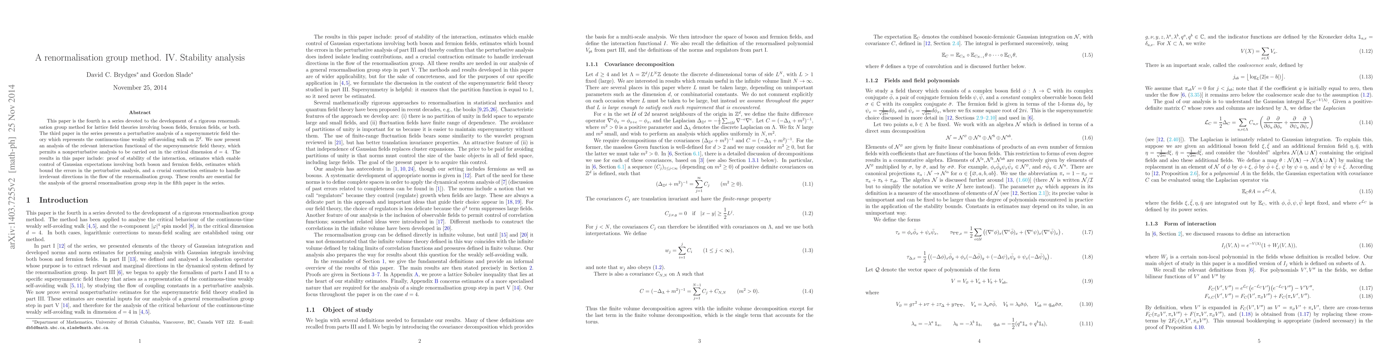 This paper is the fourth in a series devoted to the development of a rigorous renormalisation group method for lattice field theories involving boson fields, fermion fields, or both. The third paper in the series presents a perturbative analysis of a supersymmetric field theory which represents the continuous-time weakly self-avoiding walk on $\mathbb{Z}^d$. We now present an analysis of the relevant interaction functional of the supersymmetric field theory, which permits a nonperturbative analysis to be carried out in the critical dimension $d = 4$. The results in this paper include: proof of stability of the interaction, estimates which enable control of Gaussian expectations involving both boson and fermion fields, estimates which bound the errors in the perturbative analysis, and a crucial contraction estimate to handle irrelevant directions in the flow of the renormalisation group. These results are essential for the analysis of the general renormalisation group step in the fifth paper in the series.