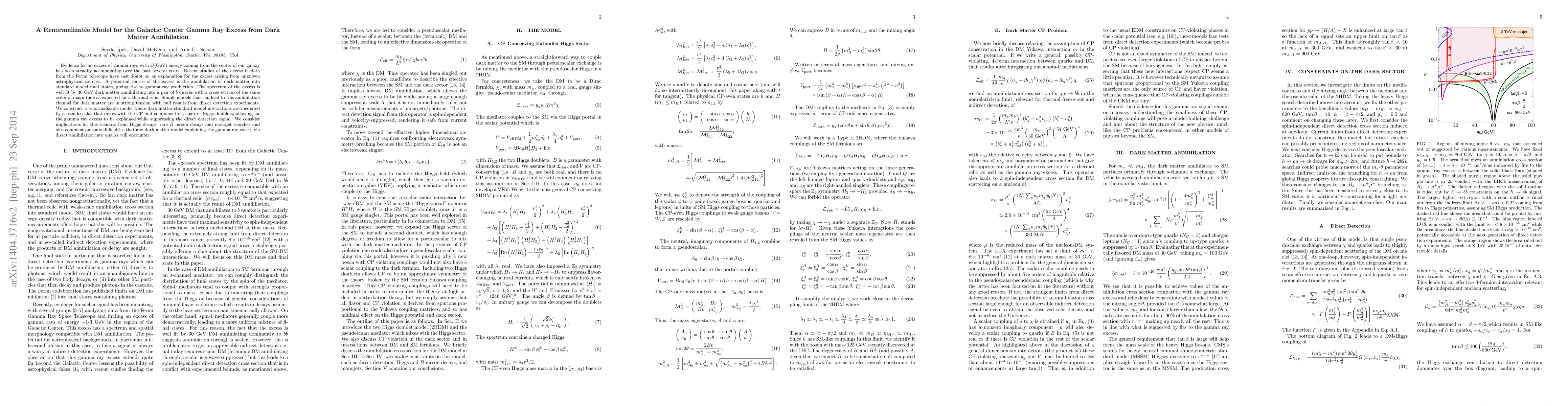 Evidence for an excess of gamma rays with O(GeV) energy coming from the center of our galaxy has been steadily accumulating over the past several years. Recent studies of the excess in data from the Fermi telescope have cast doubt on an explanation for the excess arising from unknown astrophysical sources. A potential source of the excess is the annihilation of dark matter into standard model final states, giving rise to gamma ray production. The spectrum of the excess is well fit by 30 GeV dark matter annihilating into a pair of b quarks with a cross section of the same order of magnitude as expected for a thermal relic. Simple models that can lead to this annihilation channel for dark matter are in strong tension with null results from direct detection experiments. We construct a renormalizable model where dark matter-standard model interactions are mediated by a pseudoscalar that mixes with the CP-odd component of a pair of Higgs doublets, allowing for the gamma ray excess to be explained while suppressing the direct detection signal. We consider implications for this scenario from Higgs decays, rare B meson decays and monojet searches and also comment on some difficulties that any dark matter model explaining the gamma ray excess via direct annihilation into quarks will encounter.