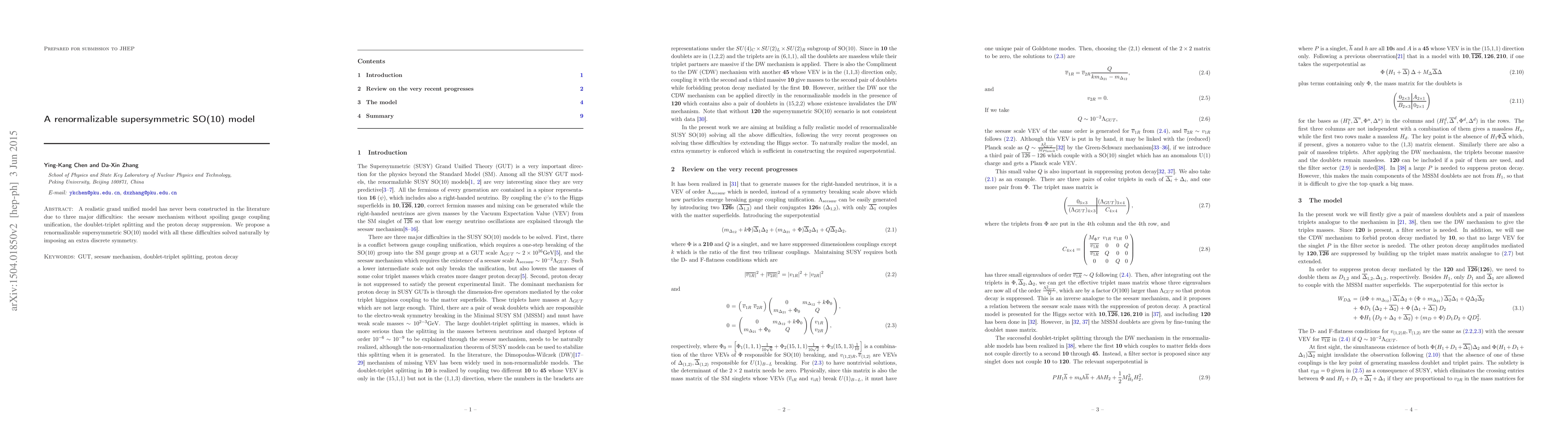 This paper proposes a renormalizable supersymmetric SO(10) grand unified model that resolves three major challenges: integrating the seesaw mechanism without disrupting gauge coupling unification, achieving doublet-triplet splitting, and suppressing proton decay, all by introducing an additional discrete symmetry.