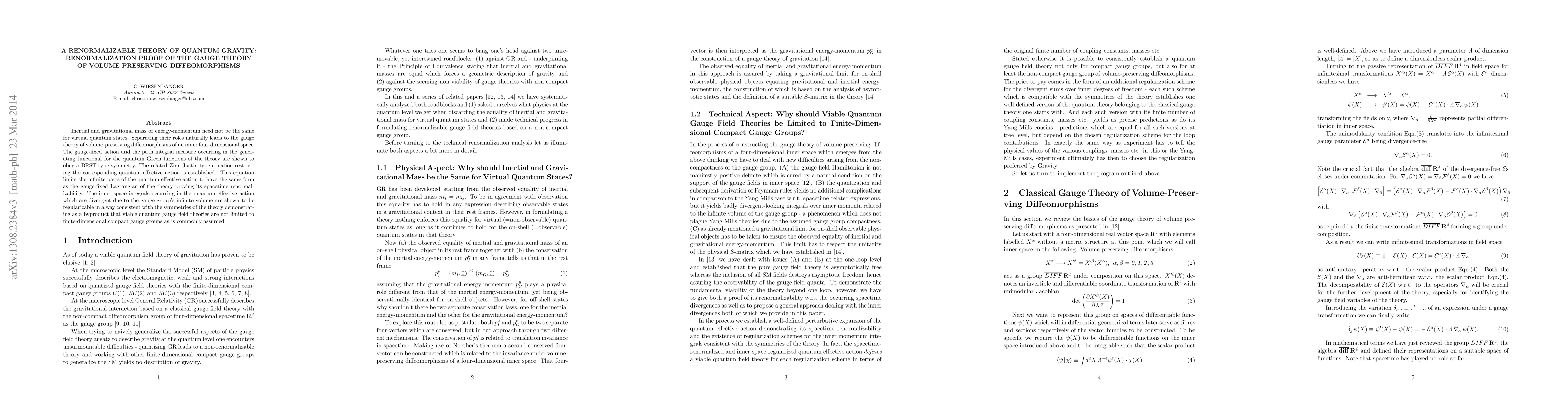 Inertial and gravitational mass or energy-momentum need not be the same for virtual quantum states. Separating their roles naturally leads to the gauge theory of volume-preserving diffeomorphisms of an inner four-dimensional space. The gauge-fixed action and the path integral measure occurring in the generating functional for the quantum Green functions of the theory are shown to obey a BRST-type symmetry. The related Zinn-Justin-type equation restricting the corresponding quantum effective action is established. This equation limits the infinite parts of the quantum effective action to have the same form as the gauge-fixed Lagrangian of the theory proving its spacetime renormalizability. The inner space integrals occurring in the quantum effective action which are divergent due to the gauge group's infinite volume are shown to be regularizable in a way consistent with the symmetries of the theory demonstrating as a byproduct that viable quantum gauge field theories are not limited to finite-dimensional compact gauge groups as is commonly assumed.