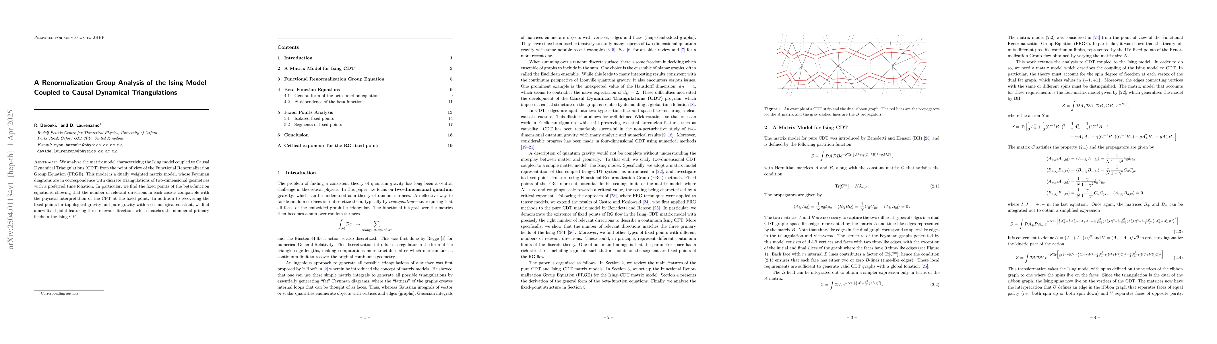 The application of FRGE to the dually weighted matrix model of the Ising model coupled to CDT, leading to the discovery of a new fixed point relevant to the Ising CFT.
