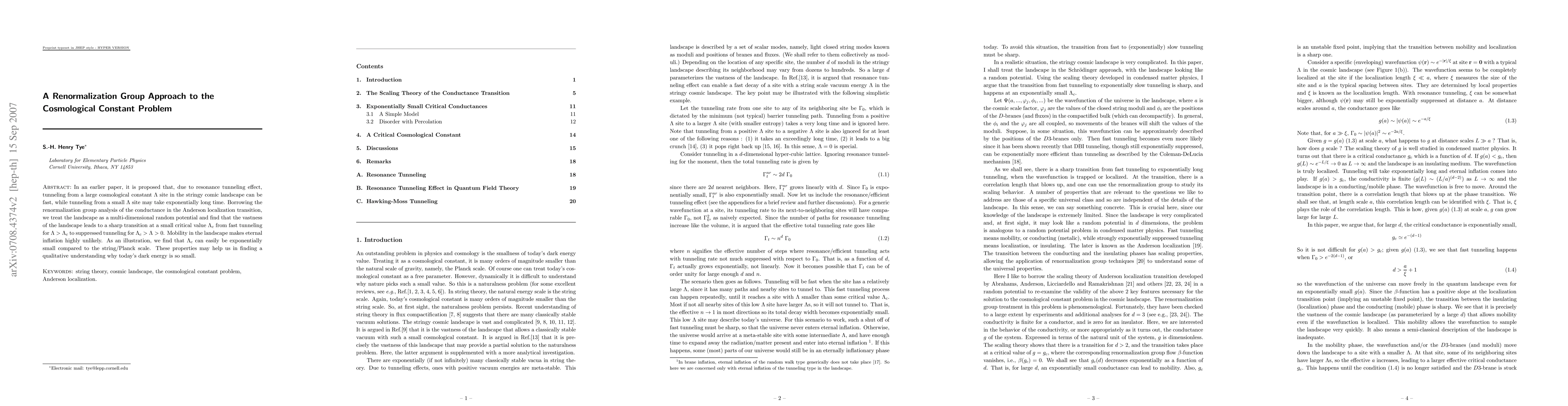 In an earlier paper, it is proposed that, due to resonance tunneling effect, tunneling from a large cosmological constant $\Lambda$ site in the stringy comic landscape can be fast, while tunneling from a small $\Lambda$ site may take exponentially long time. Borrowing the renormalization group analysis of the conductance in the Anderson localization transition, we treat the landscape as a multi-dimensional random potential and find that the vastness of the landscape leads to a sharp transition at a small critical value $\Lambda_{c}$ from fast tunneling for $\Lambda > \Lambda_{c} $ to suppressed tunneling for $\Lambda_{c} > \Lambda >0$. Mobility in the landscape makes eternal inflation highly unlikely. As an illustration, we find that $\Lambda_{c}$ can easily be exponentially small compared to the string/Planck scale. These properties may help us in finding a qualitative understanding why today's dark energy is so small.