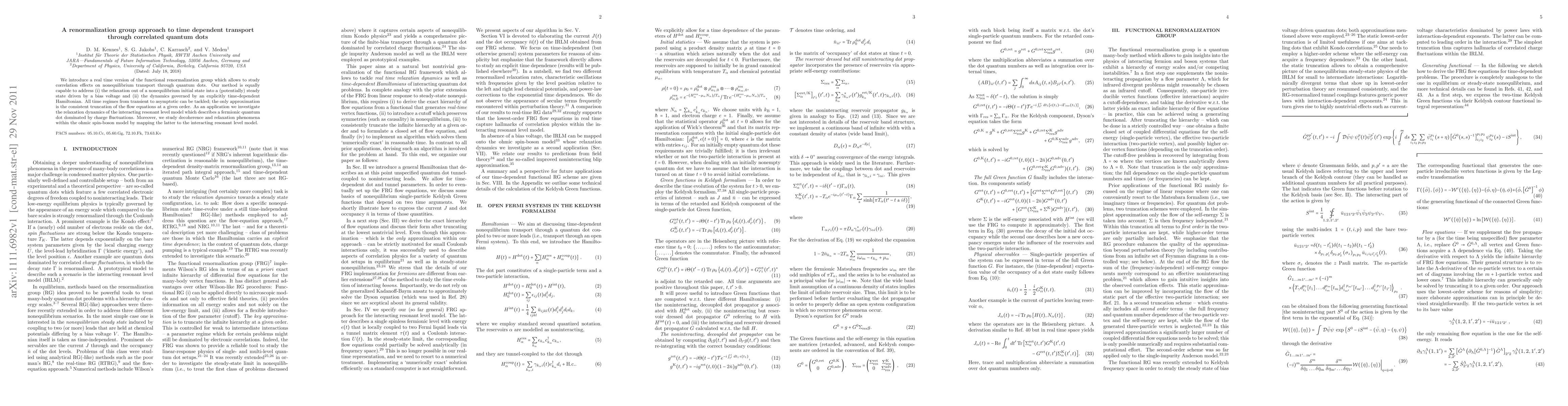 This paper presents a real-time functional renormalization group method to study nonequilibrium transport through correlated quantum dots, focusing on relaxation and dynamics in time-dependent Hamiltonians. It applies this method to analyze the relaxation dynamics of the interacting resonant level model and decoherence in the ohmic spin-boson model.
