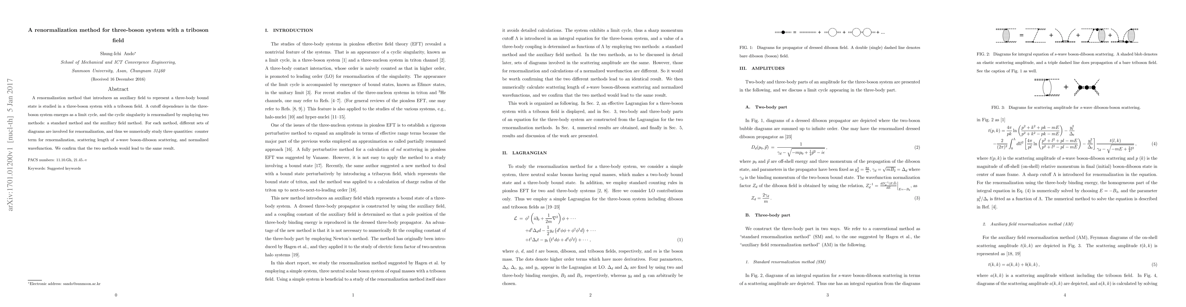 This paper develops a renormalization method for a three-boson system using an auxiliary field to represent a three-body bound state. It examines two methods to renormalize a cutoff dependence, confirming they yield identical results through the analysis of counter terms, scattering length, and normalized wavefunction.