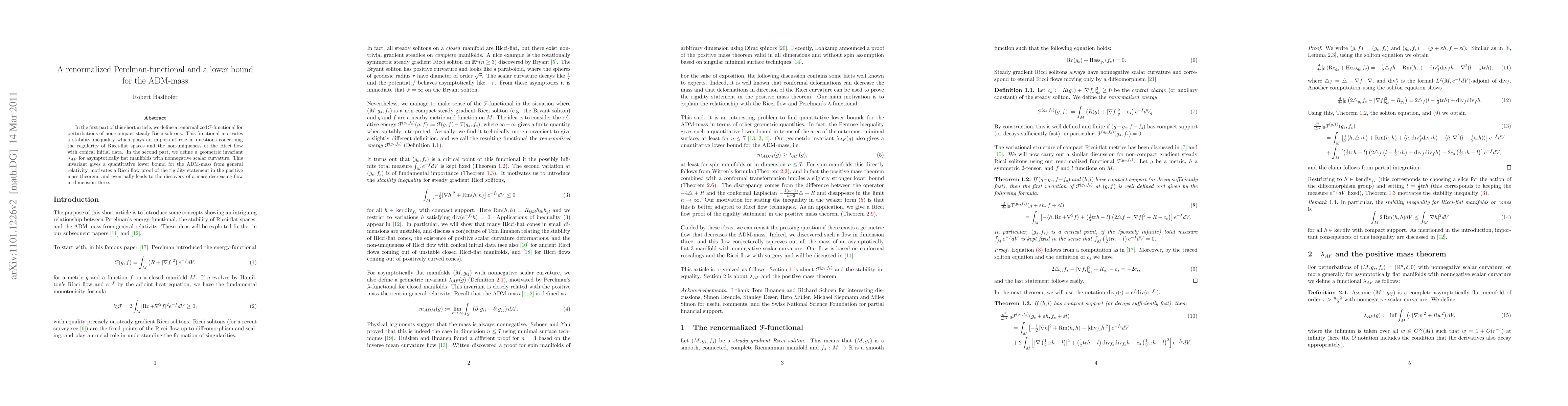 In the first part of this short article, we define a renormalized F-functional for perturbations of non-compact steady Ricci solitons. This functional motivates a stability inequality which plays an important role in questions concerning the regularity of Ricci-flat spaces and the non-uniqueness of the Ricci flow with conical initial data. In the second part, we define a geometric invariant lambda_AF for asymptotically flat manifolds with nonnegative scalar curvature. This invariant gives a quantitative lower bound for the ADM-mass from general relativity, motivates a Ricci flow proof of the rigidity statement in the positive mass theorem, and eventually leads to the discovery of a mass decreasing flow in dimension three.